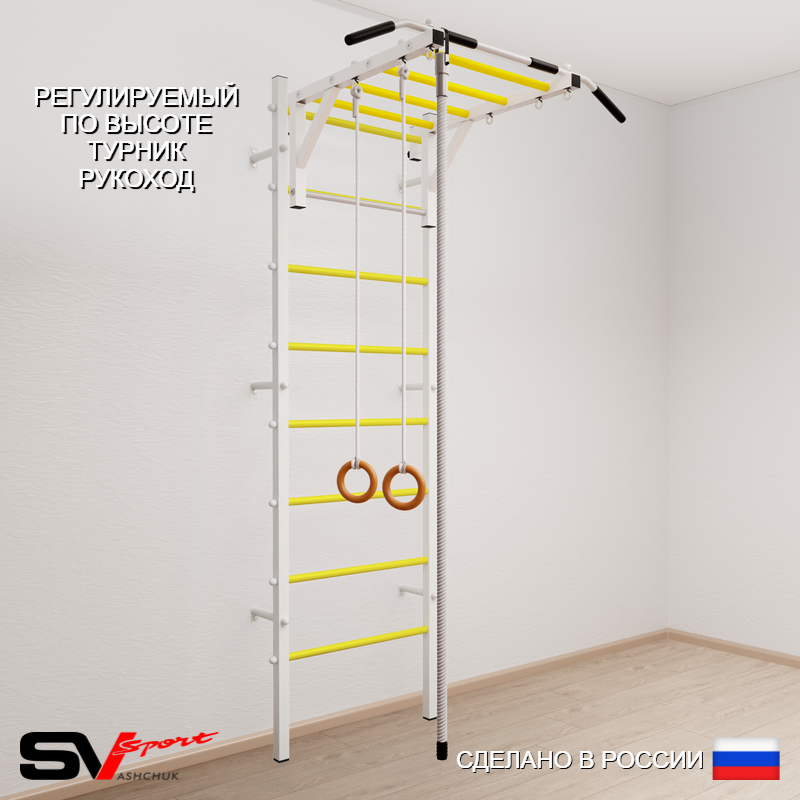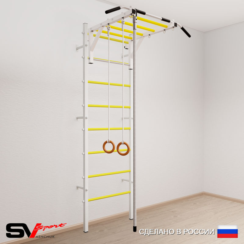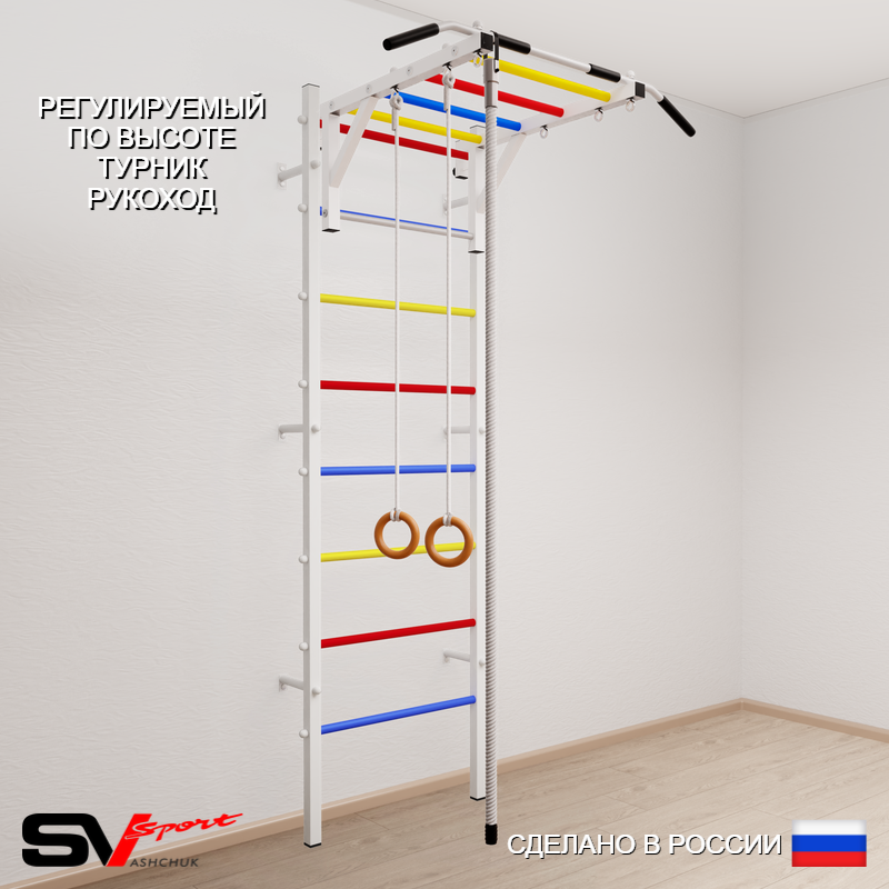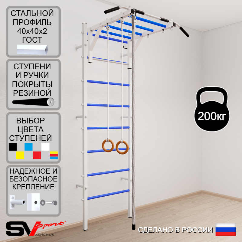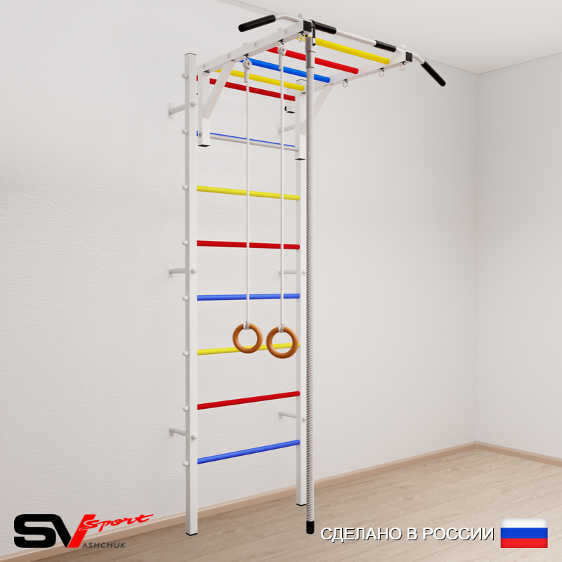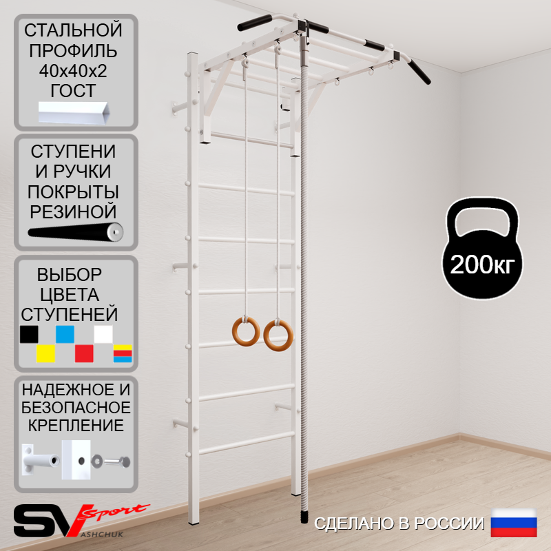 КОМПЛЕКТАЦИЯ: Шведская стенка Sv Sport (профиль вертикальных стоек 40 х 40 х 2 мм), Турник Sv Sport рукоход к ШС, Kанат, Kольца деревянные.