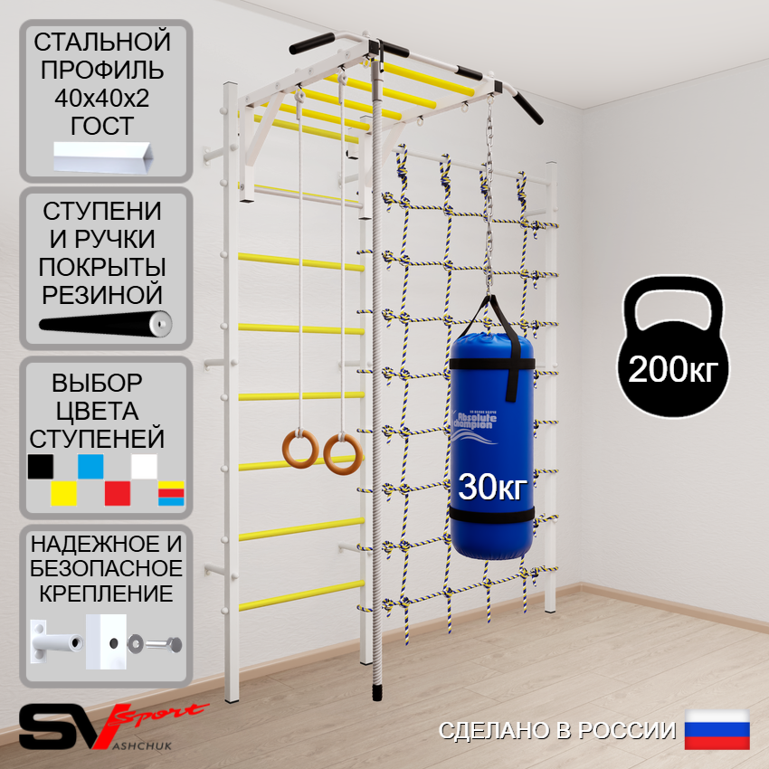 КОМПЛЕКТАЦИЯ: Шведская стенка Sv Sport (профиль вертикальных стоек 40 х 40 х 2 мм), Турник Sv Sport рукоход к ШС, Kанат, Kольца деревянные, Цепь удлинитель 90см, Мешок боксерский 30кг, Канатный лаз.