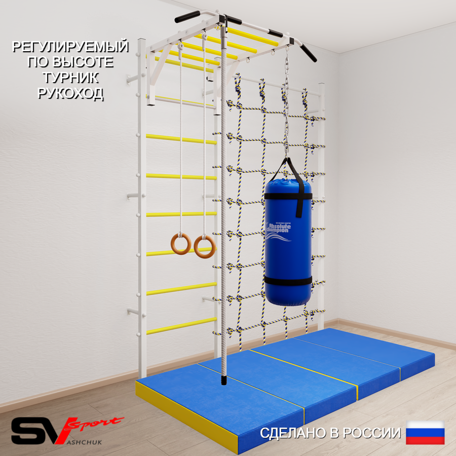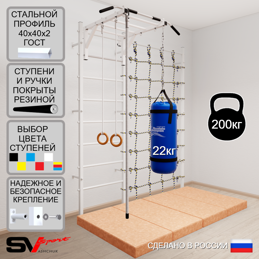 КОМПЛЕКТАЦИЯ: Шведская стенка Sv Sport (профиль вертикальных стоек 40 х 40 х 2 мм), Турник Sv Sport рукоход к ШС, Kанат, Kольца деревянные, Цепь удлинитель 90см, Мешок боксерский 22кг, Спортивный мат 100 х 200 х 10 см складной, Канатный лаз.