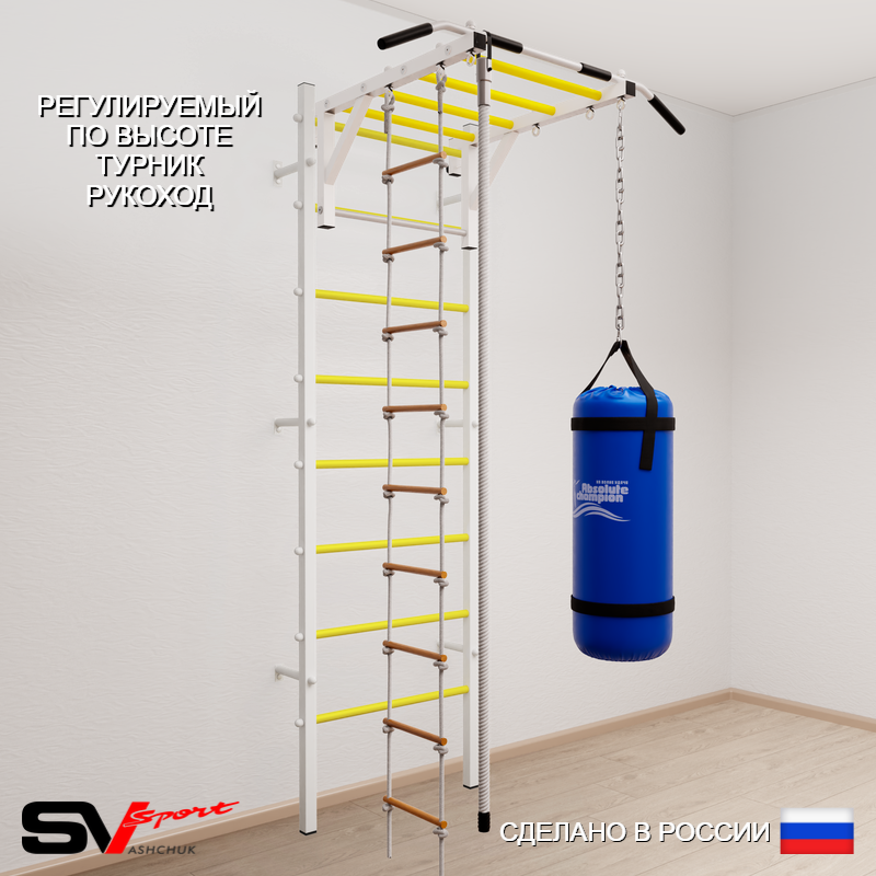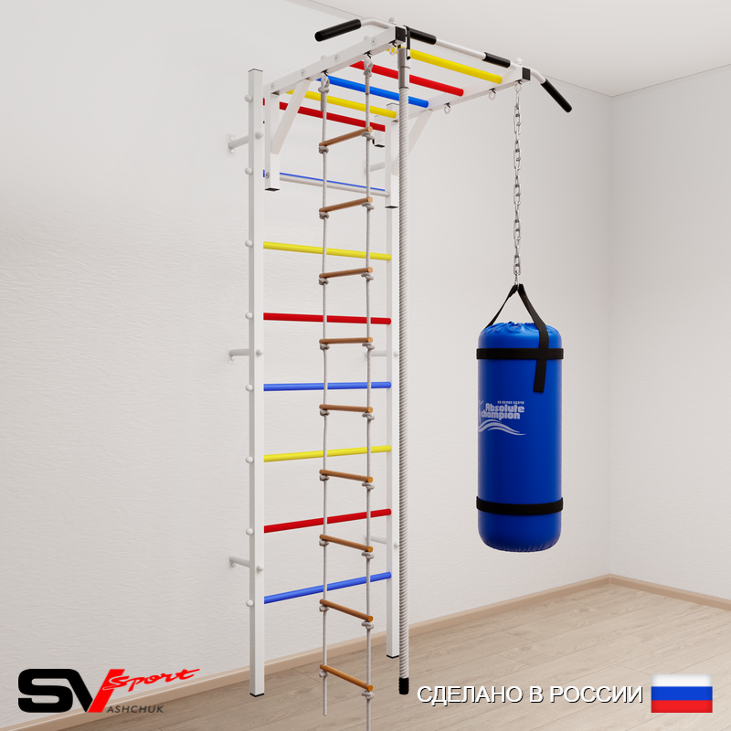 КОМПЛЕКТАЦИЯ: Шведская стенка Sv Sport (профиль вертикальных стоек 40 х 40 х 2 мм), Турник Sv Sport рукоход к ШС, Kанат, Лестница веревочная, Цепь удлинитель 90см, Мешок боксерский 15кг.