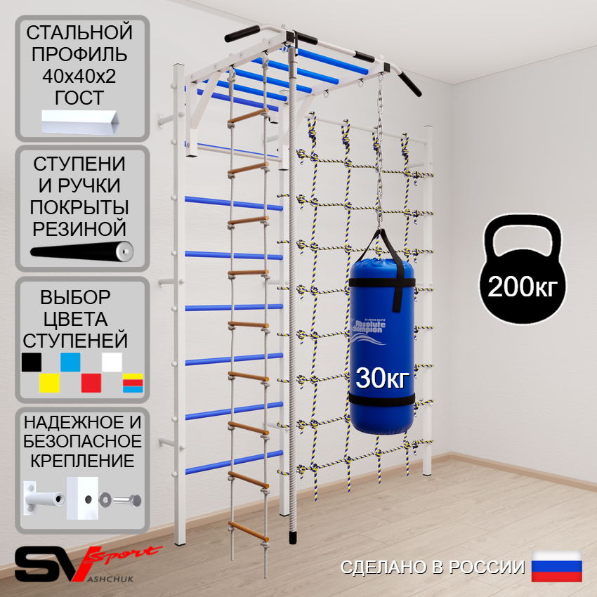 КОМПЛЕКТАЦИЯ: Шведская стенка Sv Sport (профиль вертикальных стоек 40 х 40 х 2 мм), Турник Sv Sport рукоход к ШС, Kанат, Лестница веревочная, Цепь удлинитель 90см, Мешок боксерский 30кг, Канатный лаз.