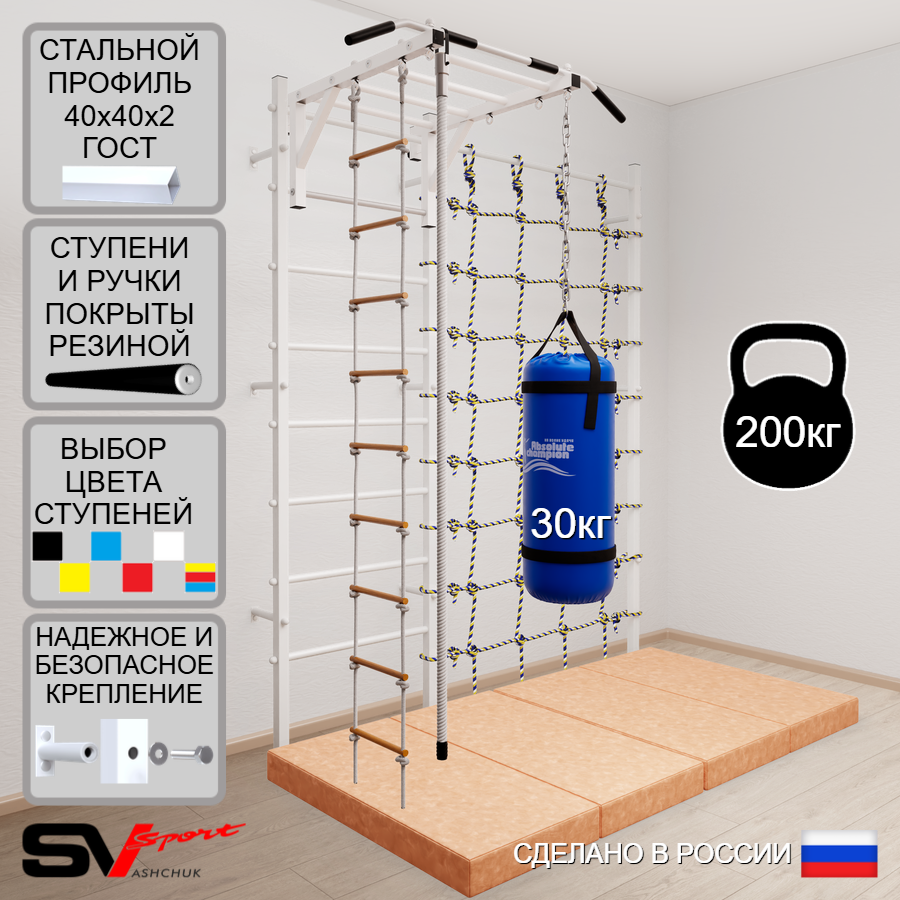 КОМПЛЕКТАЦИЯ: Шведская стенка Sv Sport (профиль вертикальных стоек 40 х 40 х 2 мм), Турник Sv Sport рукоход к ШС, Kанат, Лестница веревочная, Цепь удлинитель 90см, Мешок боксерский 30кг, Спортивный мат 100 х 200 х 10 см складной, Канатный лаз.