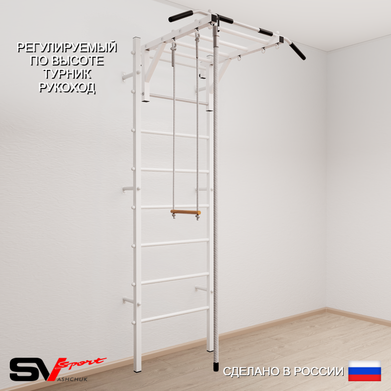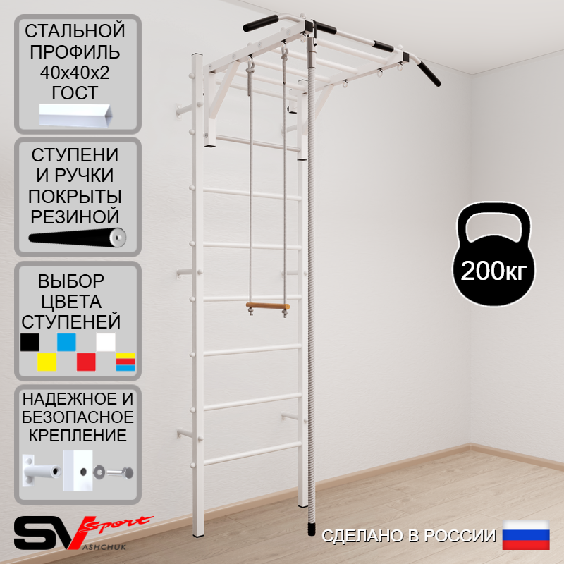 КОМПЛЕКТАЦИЯ: Шведская стенка Sv Sport (профиль вертикальных стоек 40 х 40 х 2 мм), Турник Sv Sport рукоход к ШС, Kанат, Трапеция.