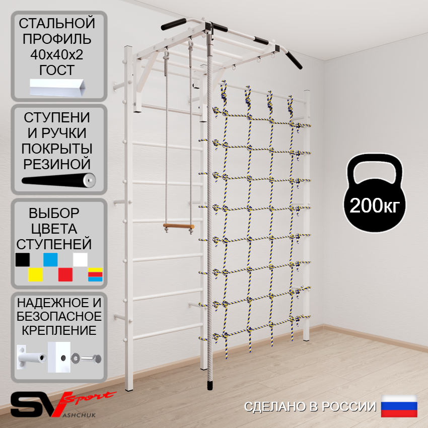 КОМПЛЕКТАЦИЯ: Шведская стенка Sv Sport (профиль вертикальных стоек 40 х 40 х 2 мм), Турник Sv Sport рукоход к ШС, Kанат, Трапеция, Канатный лаз.