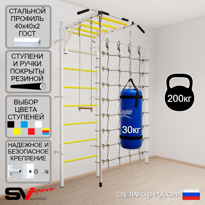 КОМПЛЕКТАЦИЯ: Шведская стенка Sv Sport (профиль вертикальных стоек 40 х 40 х 2 мм), Турник Sv Sport рукоход к ШС, Kанат, Трапеция, Цепь удлинитель 90см, Мешок боксерский 30кг, Канатный лаз.