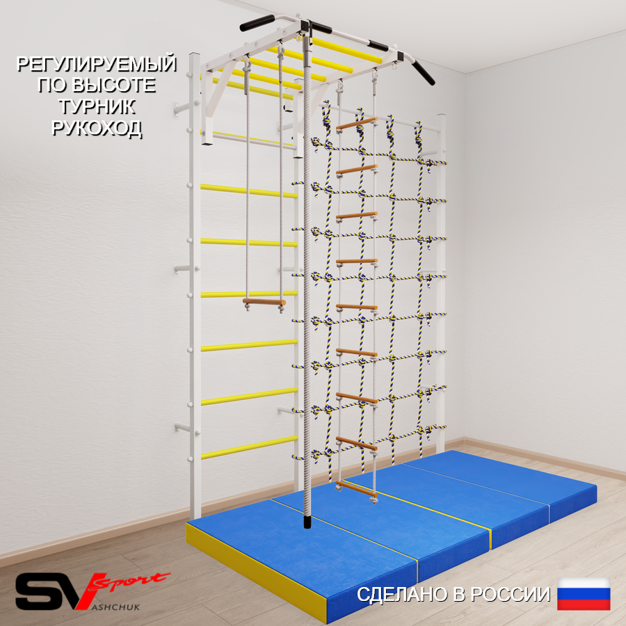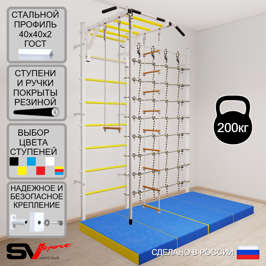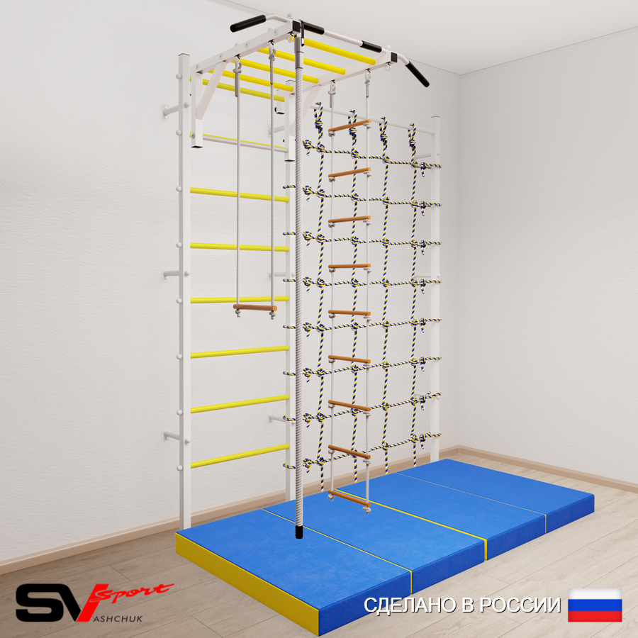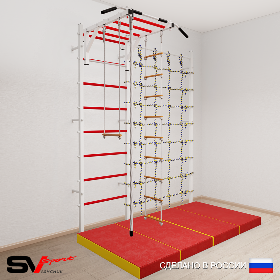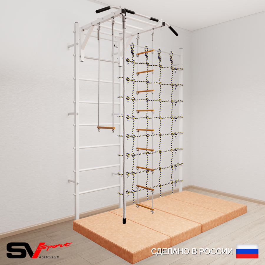 КОМПЛЕКТАЦИЯ: Шведская стенка Sv Sport (профиль вертикальных стоек 40 х 40 х 2 мм), Турник Sv Sport рукоход к ШС, Kанат, Трапеция, Лестница веревочная, Спортивный мат 100 х 200 х 10 см складной, Канатный лаз.