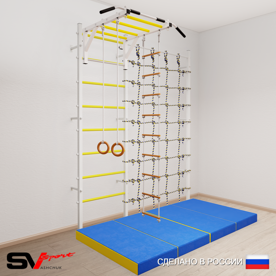 КОМПЛЕКТАЦИЯ: Шведская стенка Sv Sport (профиль вертикальных стоек 40 х 40 х 2 мм), Турник Sv Sport рукоход к ШС, Kольца деревянные, Лестница веревочная, Спортивный мат 100 х 200 х 10 см складной, Канатный лаз.