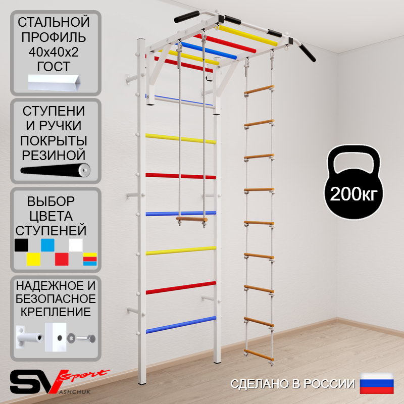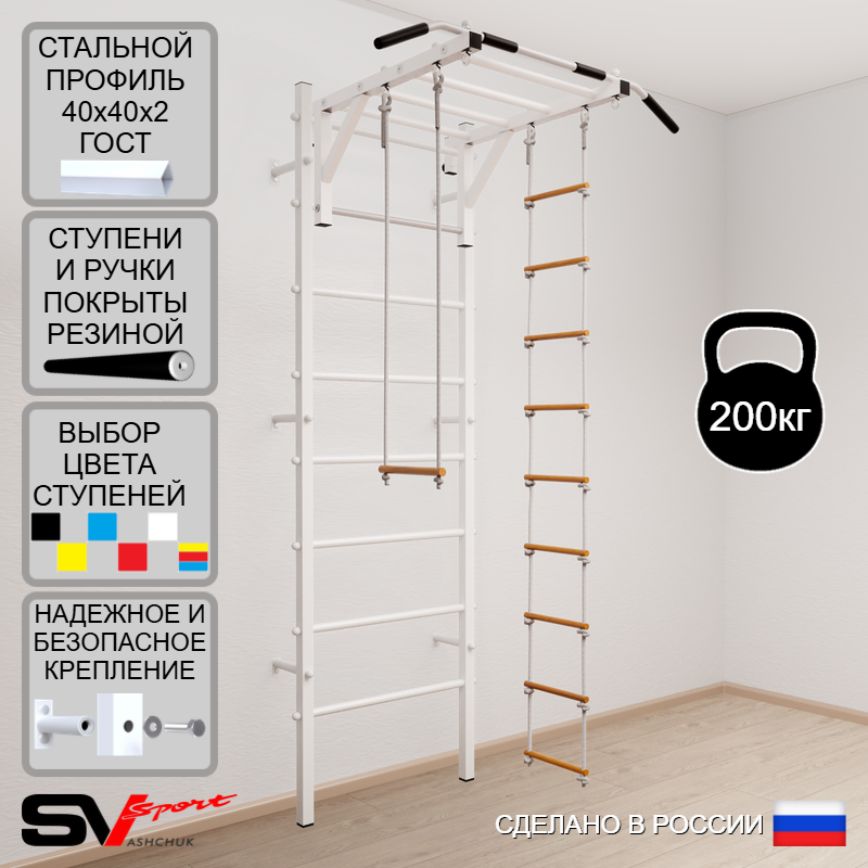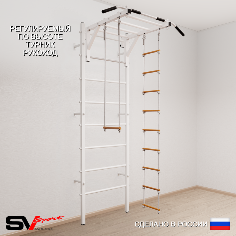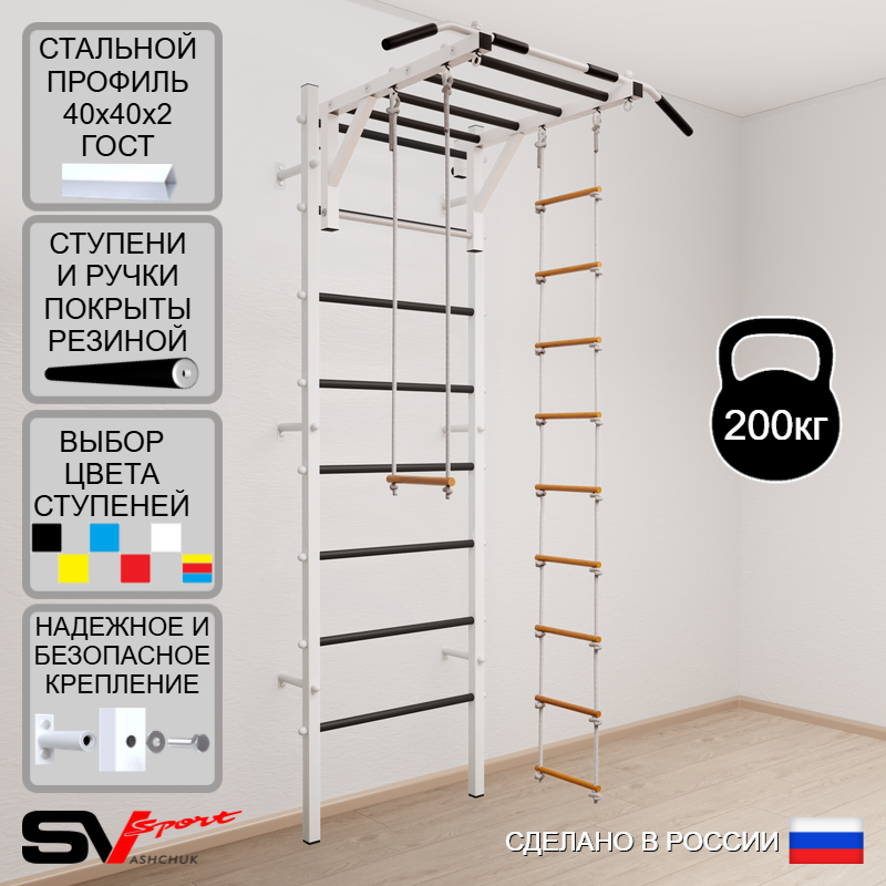 КОМПЛЕКТАЦИЯ: Шведская стенка Sv Sport (профиль вертикальных стоек 40 х 40 х 2 мм), Турник Sv Sport рукоход к ШС, Трапеция, Лестница веревочная.