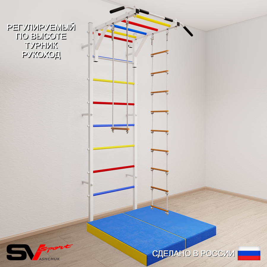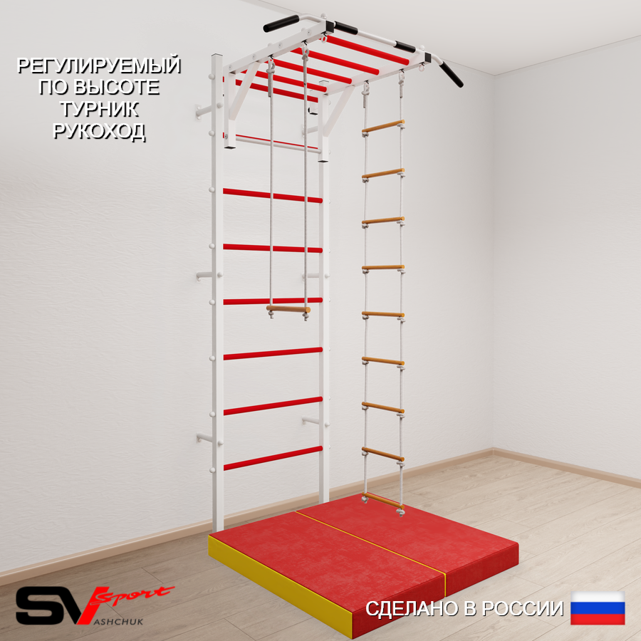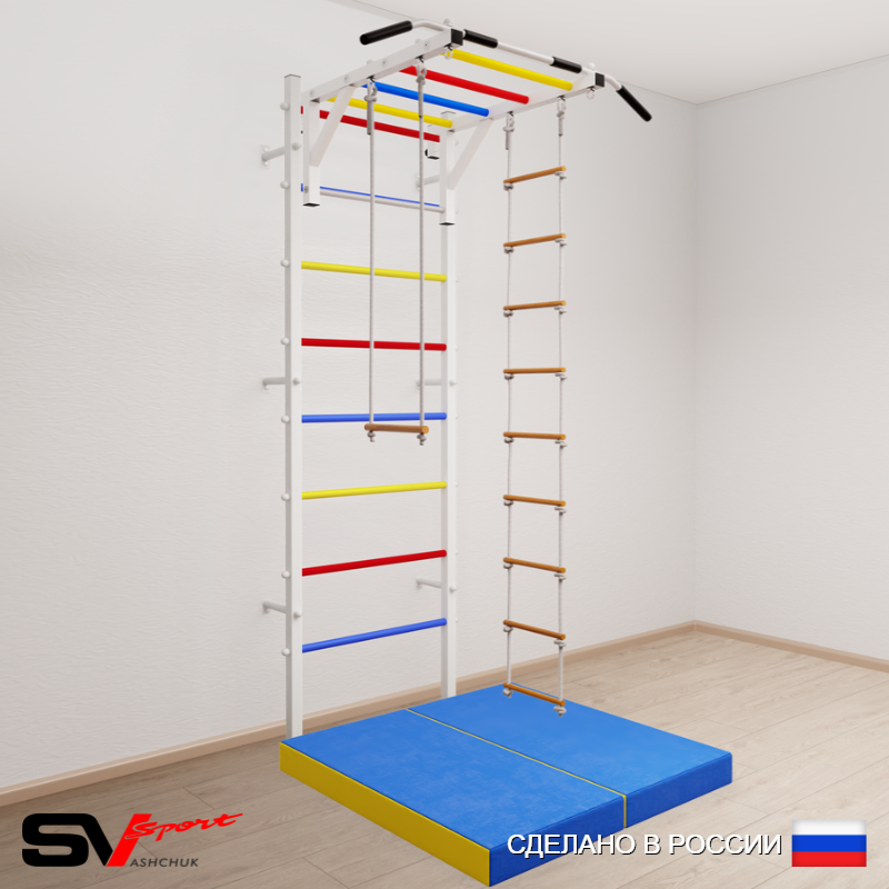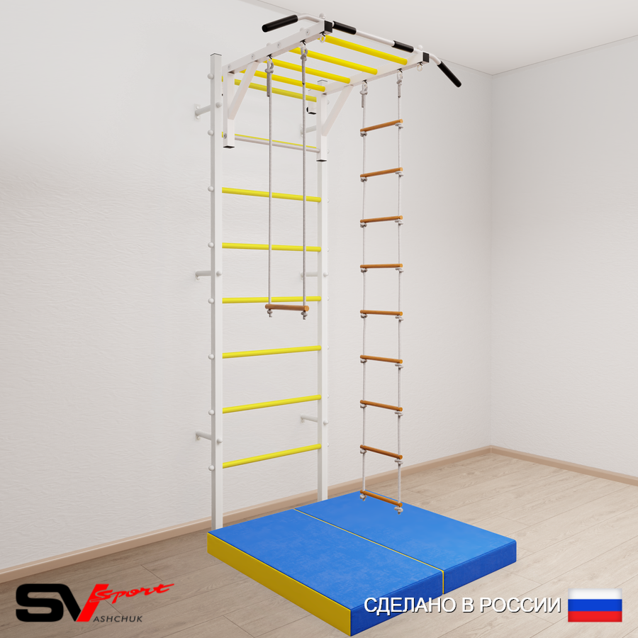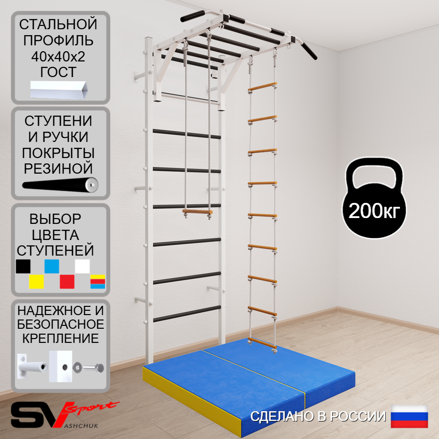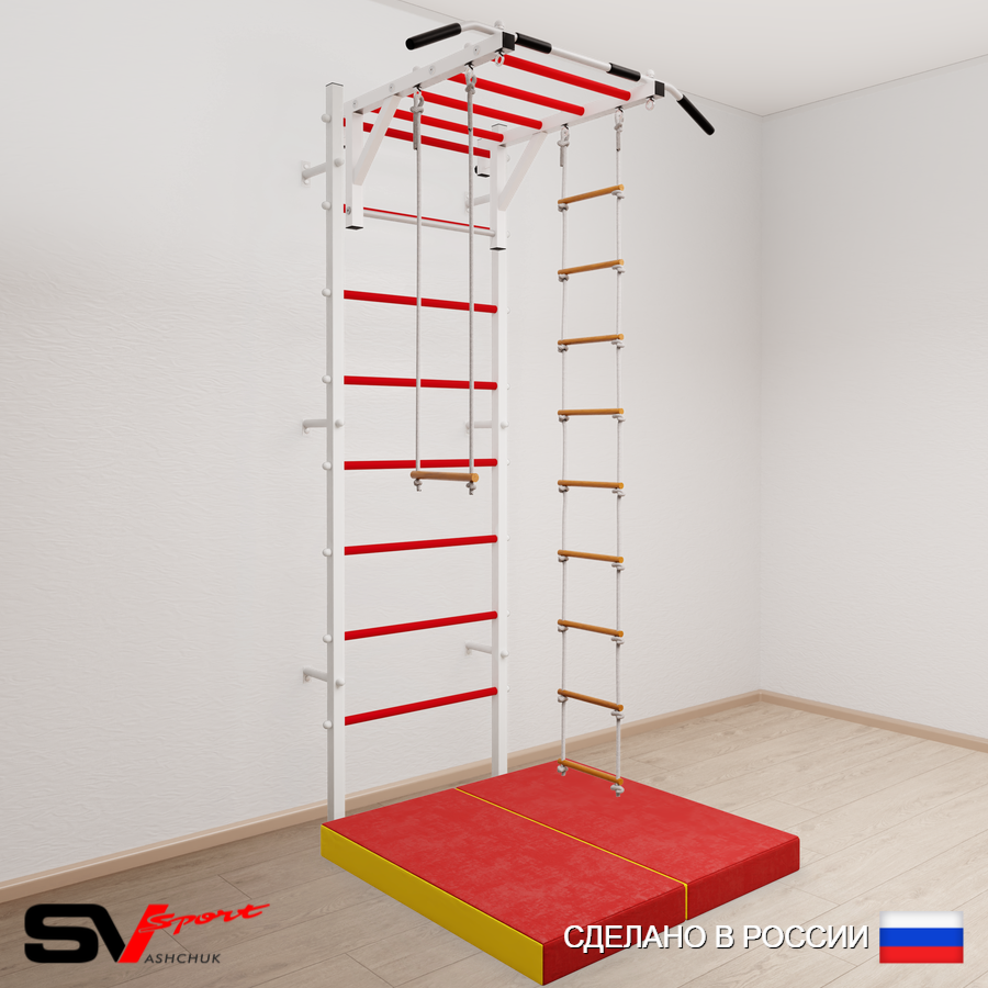 КОМПЛЕКТАЦИЯ: Шведская стенка Sv Sport (профиль вертикальных стоек 40 х 40 х 2 мм), Турник Sv Sport рукоход к ШС, Трапеция, Лестница веревочная, Спортивный мат 100 х 100 х 10 см складной.