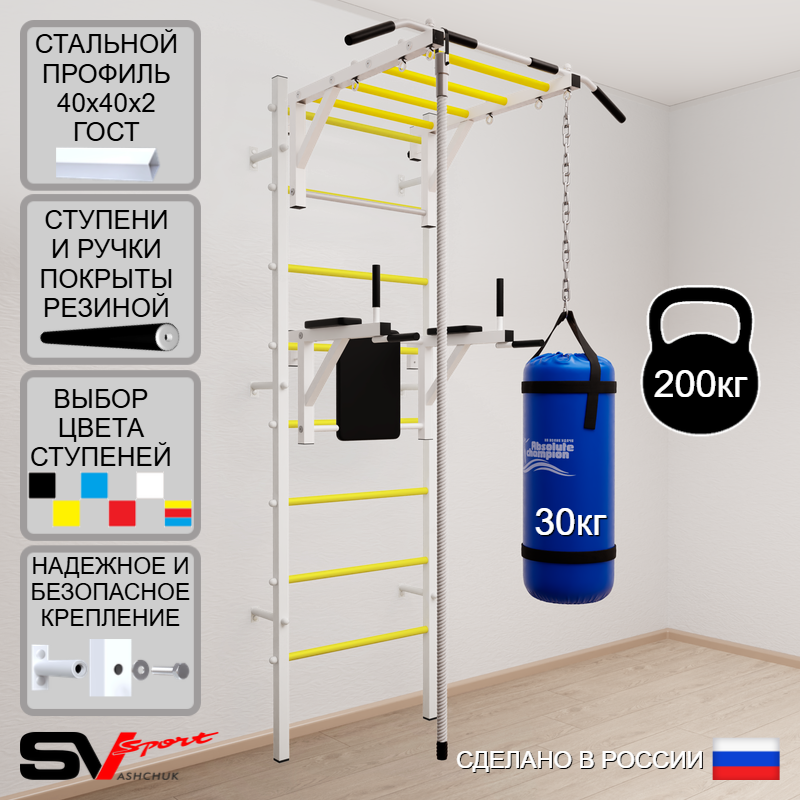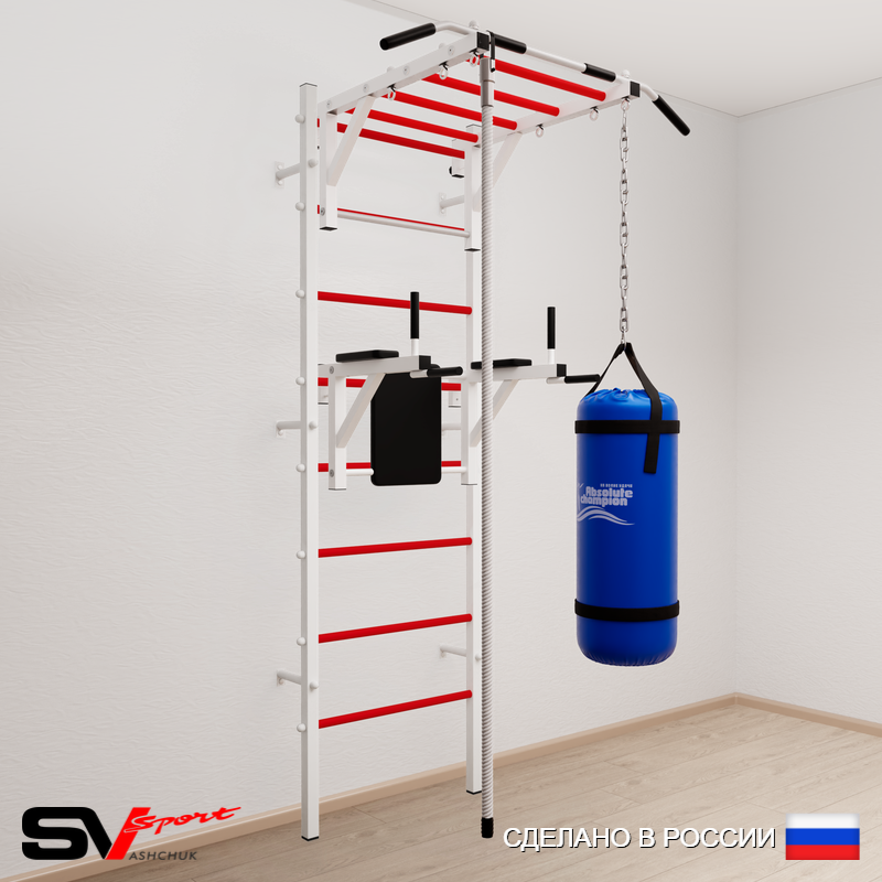 КОМПЛЕКТАЦИЯ: Шведская стенка Sv Sport (профиль вертикальных стоек 40 х 40 х 2 мм), Турник Sv Sport рукоход к ШС, Брусья Sv Sport к ШС, Kанат, Цепь удлинитель 90см, Мешок боксерский 30кг.
