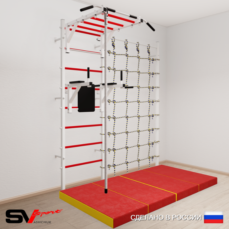 КОМПЛЕКТАЦИЯ: Шведская стенка Sv Sport (профиль вертикальных стоек 40 х 40 х 2 мм), Турник Sv Sport рукоход к ШС, Брусья Sv Sport к ШС, Kанат, Спортивный мат 100 х 200 х 10 см складной, Канатный лаз.