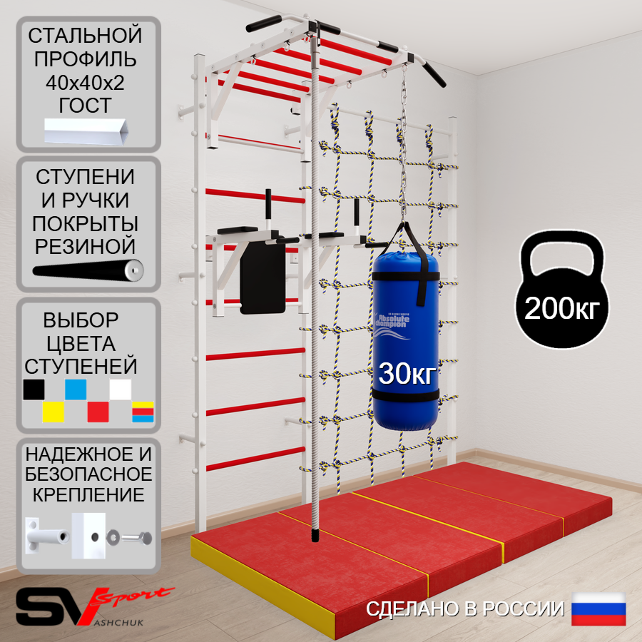 КОМПЛЕКТАЦИЯ: Шведская стенка Sv Sport (профиль вертикальных стоек 40 х 40 х 2 мм), Турник Sv Sport рукоход к ШС, Брусья Sv Sport к ШС, Kанат, Цепь удлинитель 90см, Мешок боксерский 30кг, Спортивный мат 100 х 200 х 10 см складной, Канатный лаз.