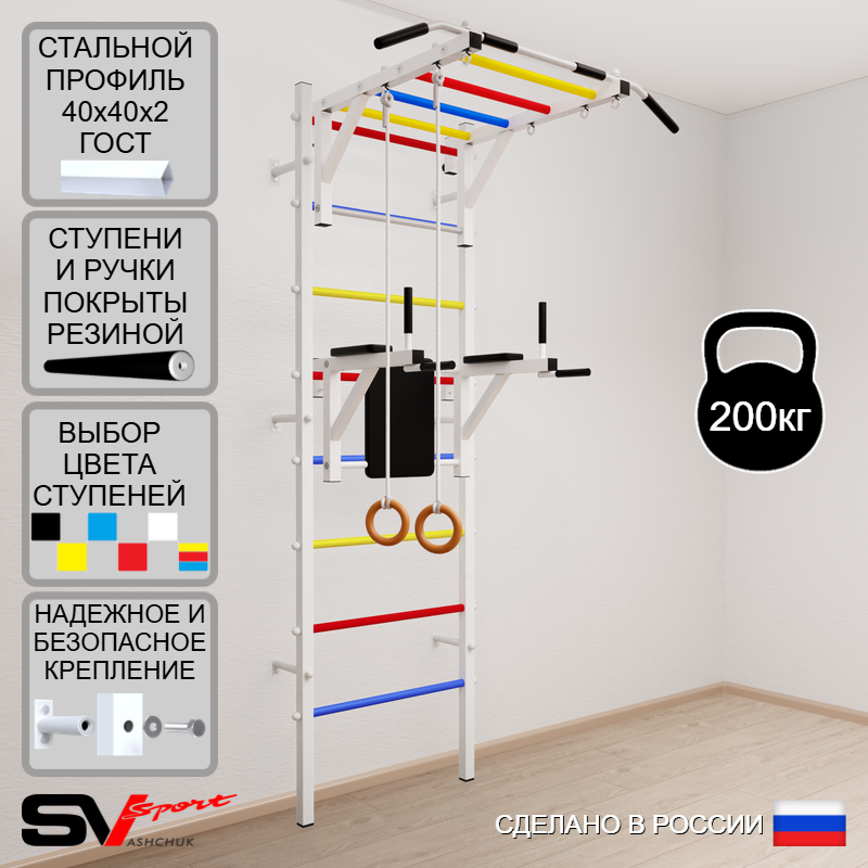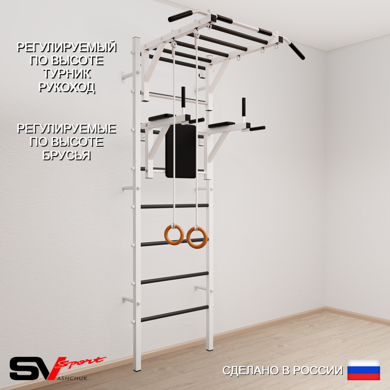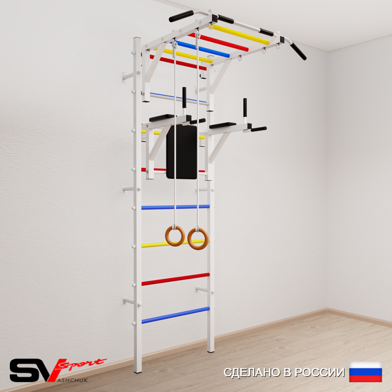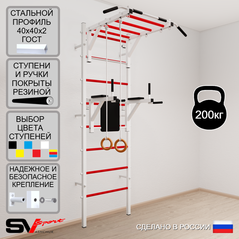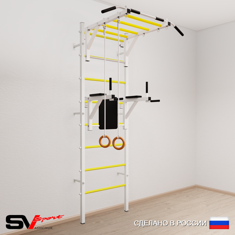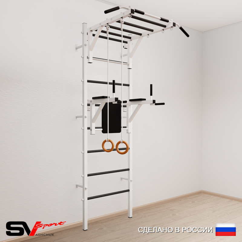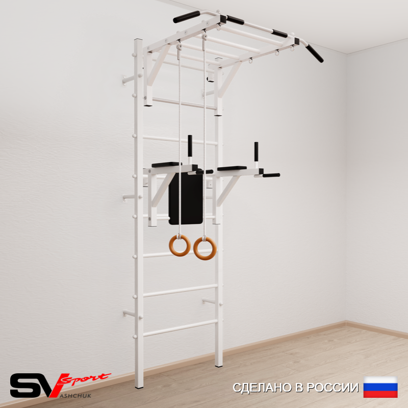 КОМПЛЕКТАЦИЯ: Шведская стенка Sv Sport (профиль вертикальных стоек 40 х 40 х 2 мм), Турник Sv Sport рукоход к ШС, Брусья Sv Sport к ШС, Kольца деревянные.