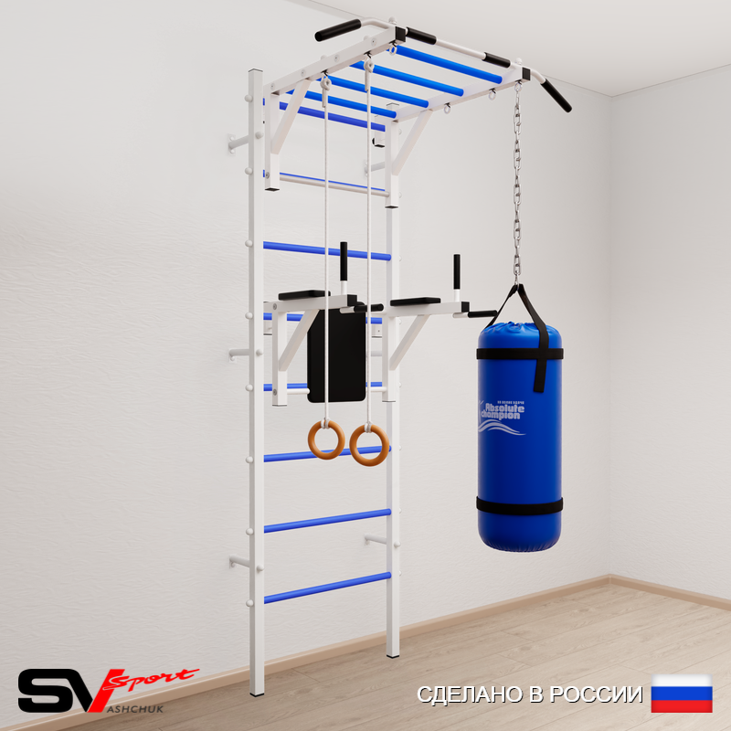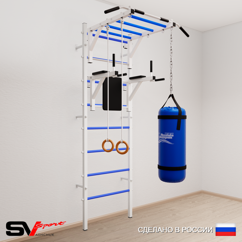КОМПЛЕКТАЦИЯ: Шведская стенка Sv Sport (профиль вертикальных стоек 40 х 40 х 2 мм), Турник Sv Sport рукоход к ШС, Брусья Sv Sport к ШС, Kольца деревянные, Цепь удлинитель 90см, Мешок боксерский 22кг.