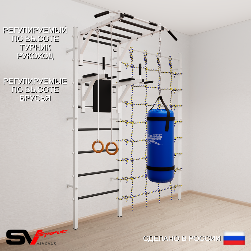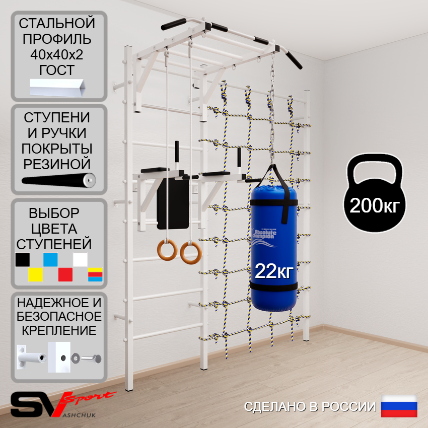 КОМПЛЕКТАЦИЯ: Шведская стенка Sv Sport (профиль вертикальных стоек 40 х 40 х 2 мм), Турник Sv Sport рукоход к ШС, Брусья Sv Sport к ШС, Kольца деревянные, Цепь удлинитель 90см, Мешок боксерский 22кг, Канатный лаз.