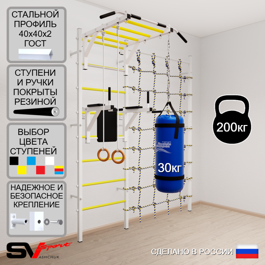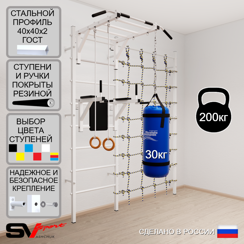 КОМПЛЕКТАЦИЯ: Шведская стенка Sv Sport (профиль вертикальных стоек 40 х 40 х 2 мм), Турник Sv Sport рукоход к ШС, Брусья Sv Sport к ШС, Kольца деревянные, Цепь удлинитель 90см, Мешок боксерский 30кг, Канатный лаз.