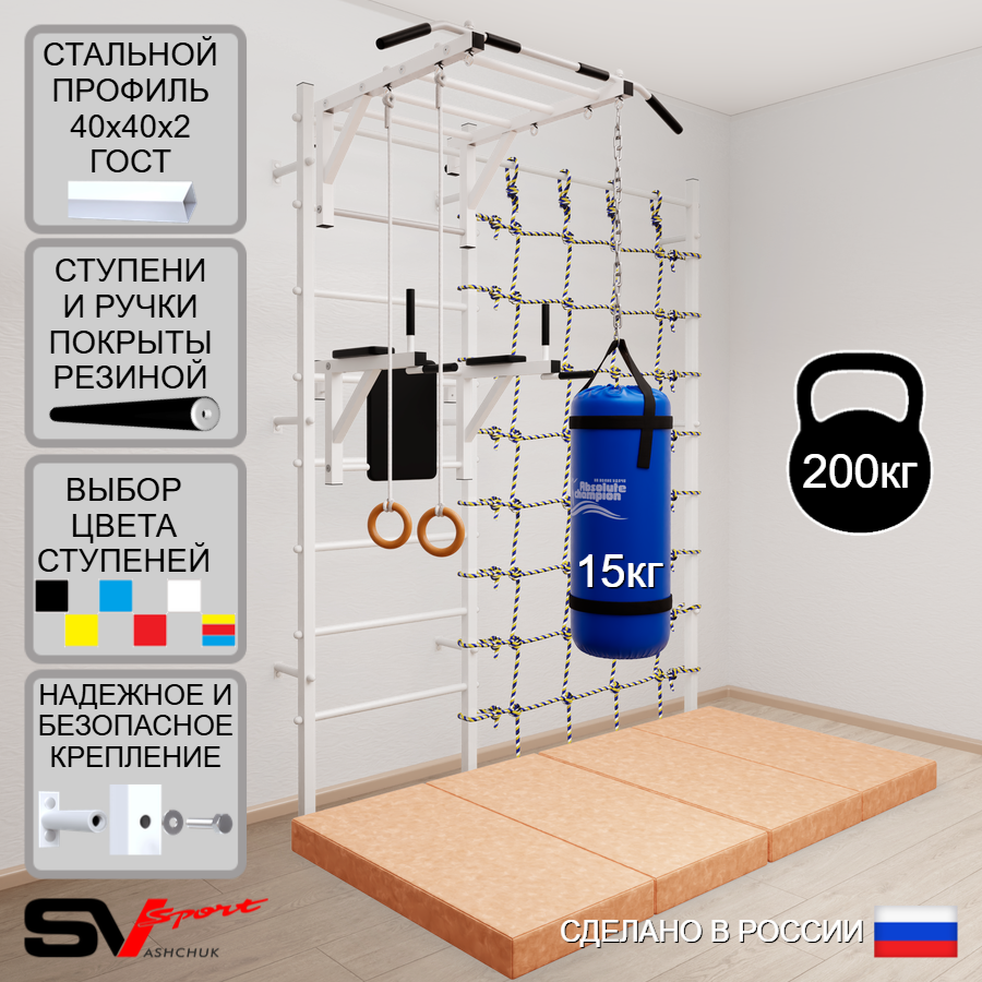 КОМПЛЕКТАЦИЯ: Шведская стенка Sv Sport (профиль вертикальных стоек 40 х 40 х 2 мм), Турник Sv Sport рукоход к ШС, Брусья Sv Sport к ШС, Kольца деревянные, Цепь удлинитель 90см, Мешок боксерский 15кг, Спортивный мат 100 х 200 х 10 см складной, Канатный лаз.