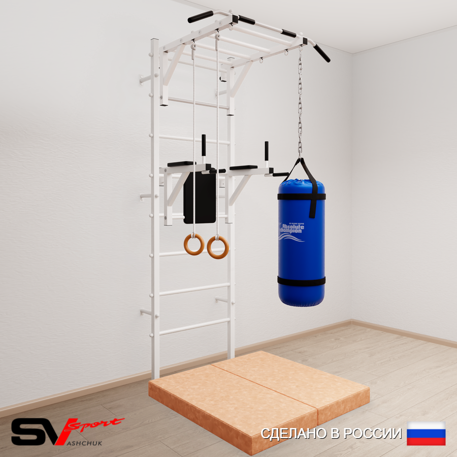 КОМПЛЕКТАЦИЯ: Шведская стенка Sv Sport (профиль вертикальных стоек 40 х 40 х 2 мм), Турник Sv Sport рукоход к ШС, Брусья Sv Sport к ШС, Kольца деревянные, Цепь удлинитель 90см, Мешок боксерский 22кг, Спортивный мат 100 х 100 х 10 см складной.