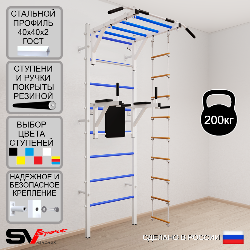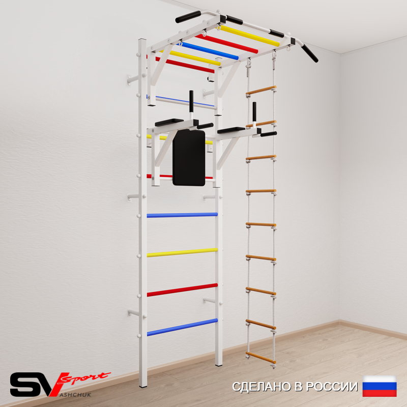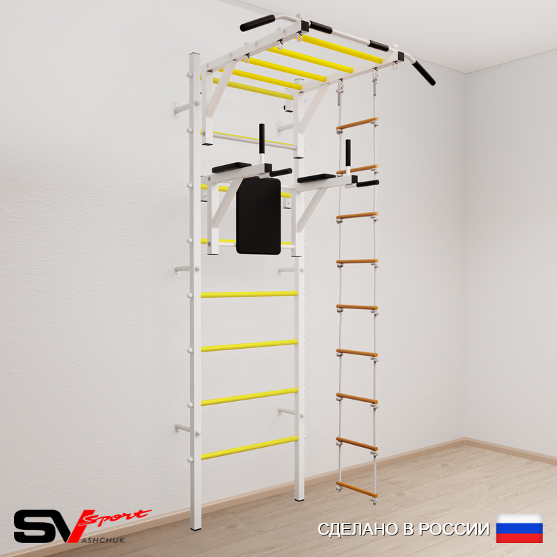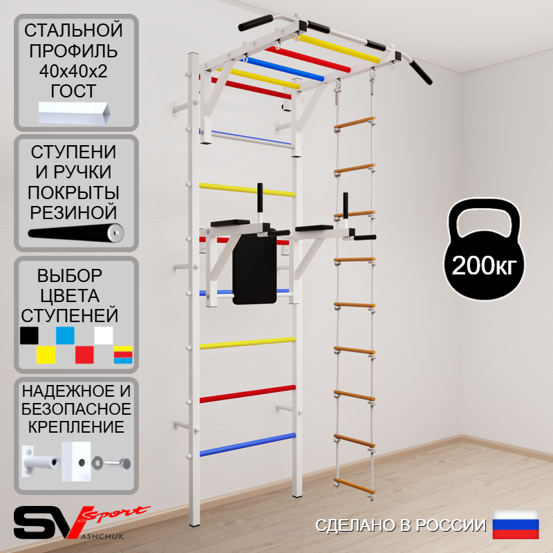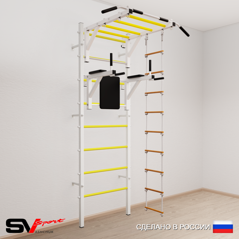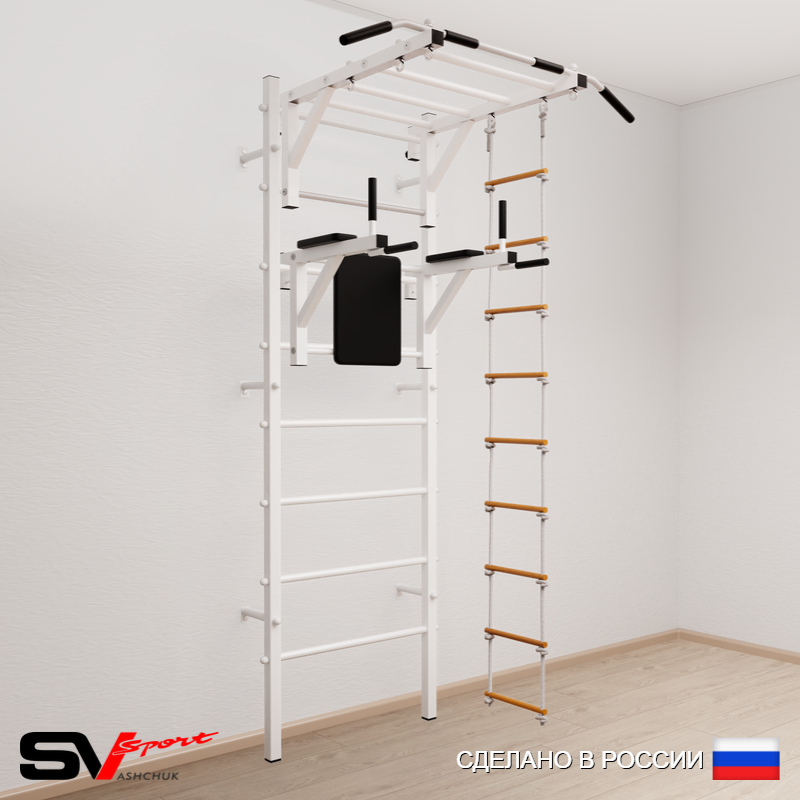 КОМПЛЕКТАЦИЯ: Шведская стенка Sv Sport (профиль вертикальных стоек 40 х 40 х 2 мм), Турник Sv Sport рукоход к ШС, Брусья Sv Sport к ШС, Лестница веревочная.