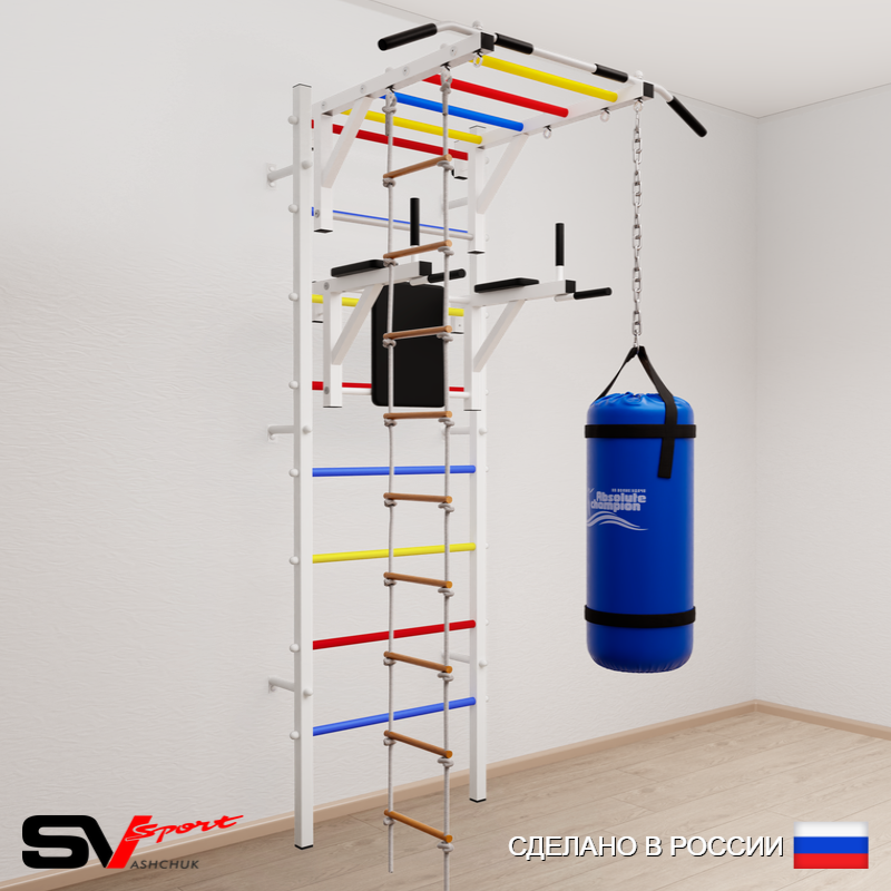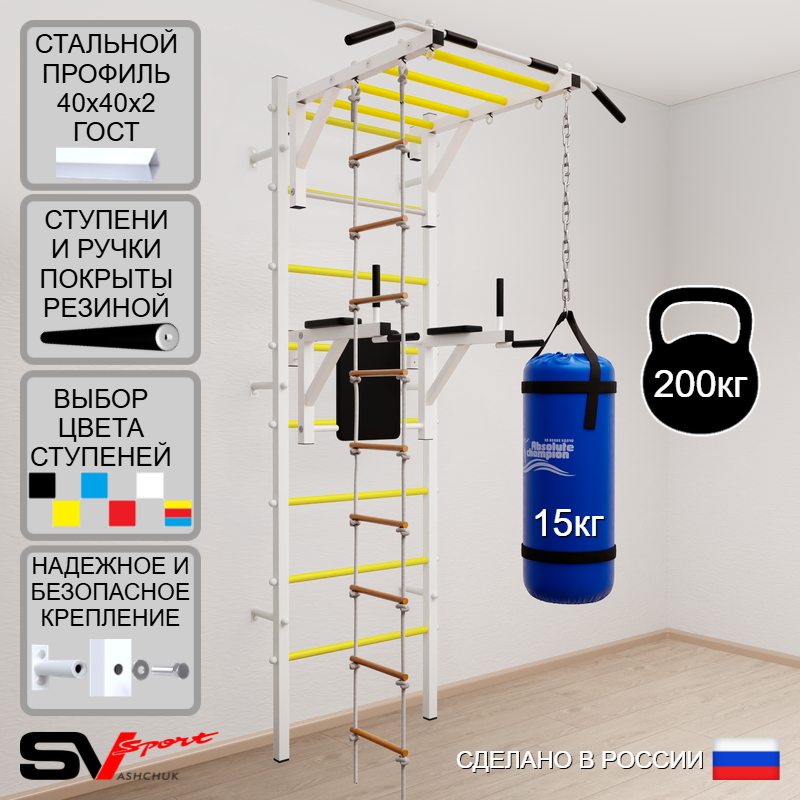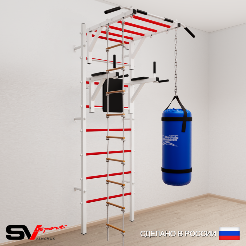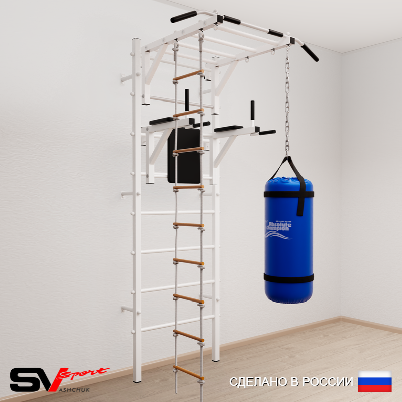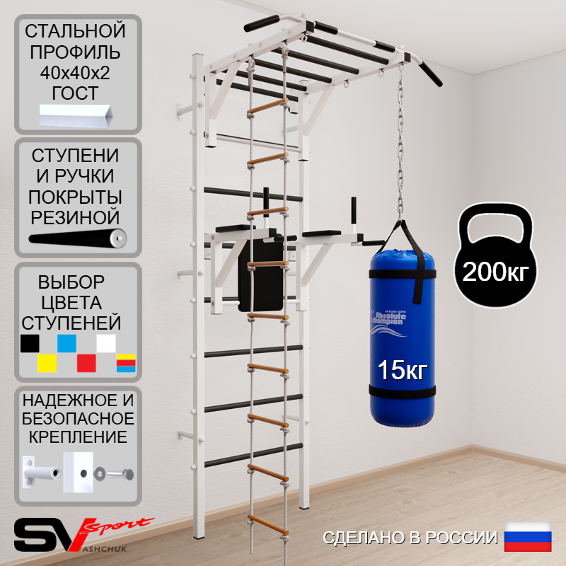 КОМПЛЕКТАЦИЯ: Шведская стенка Sv Sport (профиль вертикальных стоек 40 х 40 х 2 мм), Турник Sv Sport рукоход к ШС, Брусья Sv Sport к ШС, Лестница веревочная, Цепь удлинитель 90см, Мешок боксерский 15кг.