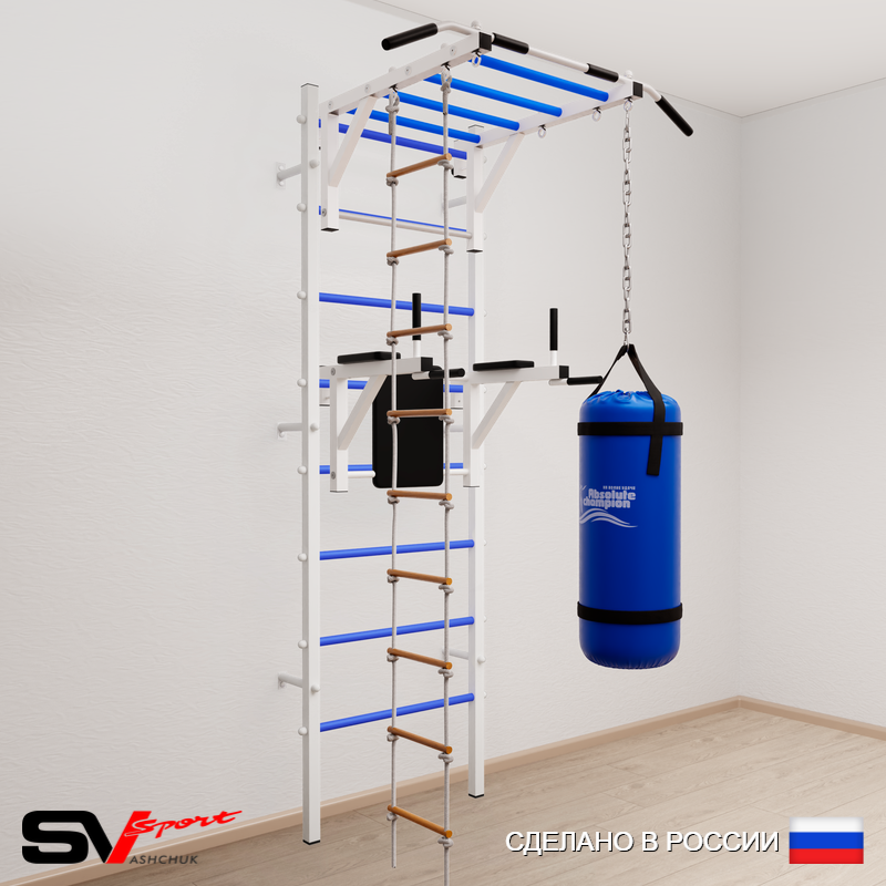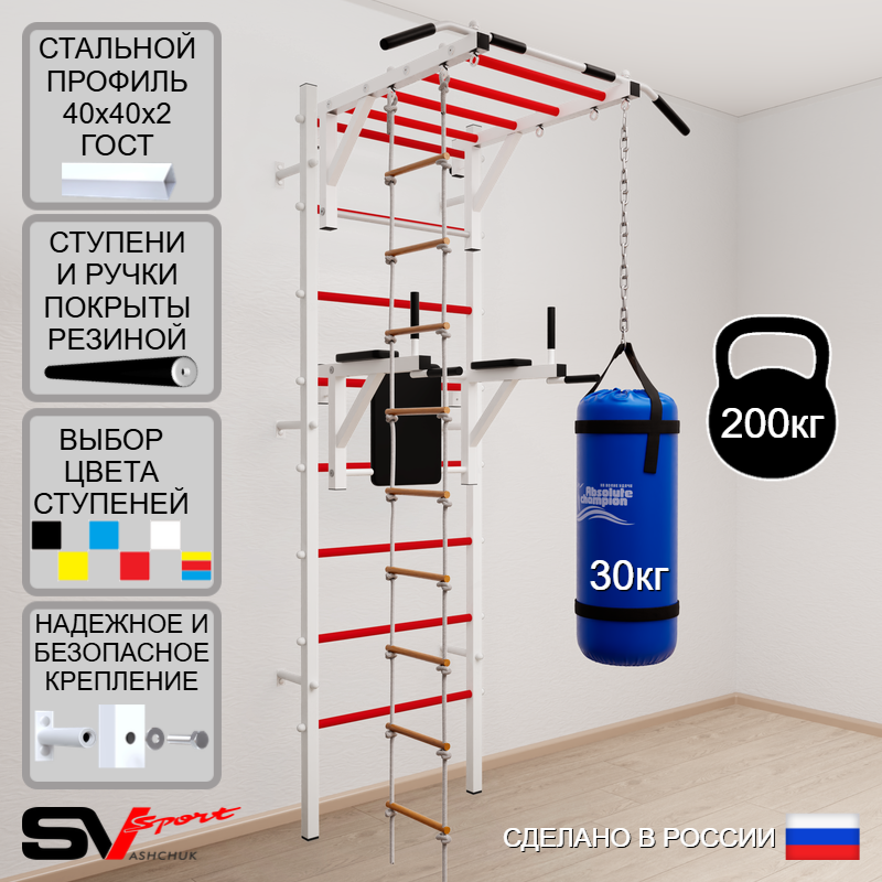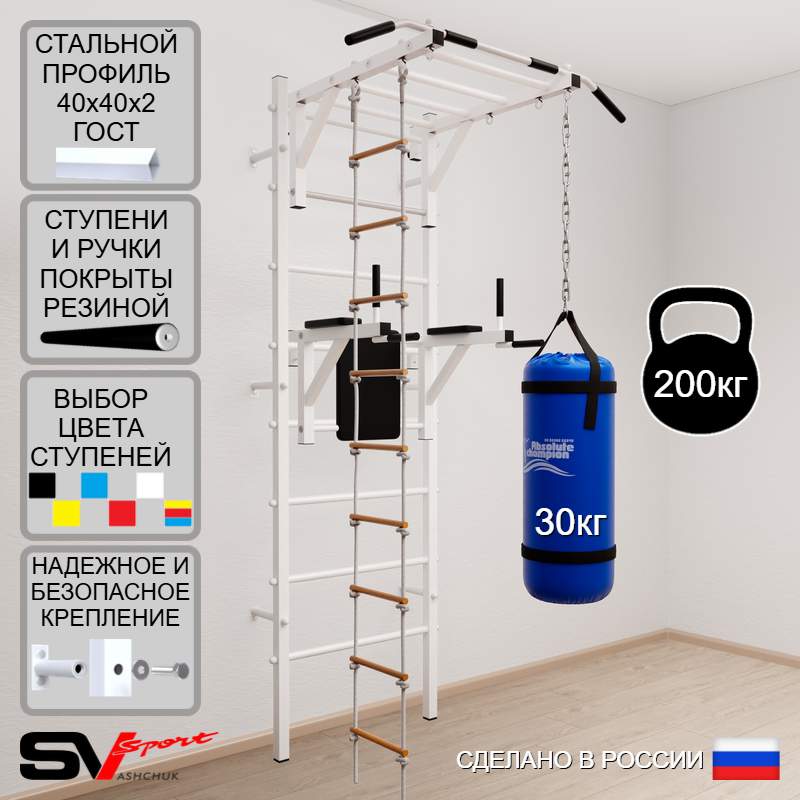 КОМПЛЕКТАЦИЯ: Шведская стенка Sv Sport (профиль вертикальных стоек 40 х 40 х 2 мм), Турник Sv Sport рукоход к ШС, Брусья Sv Sport к ШС, Лестница веревочная, Цепь удлинитель 90см, Мешок боксерский 30кг.
