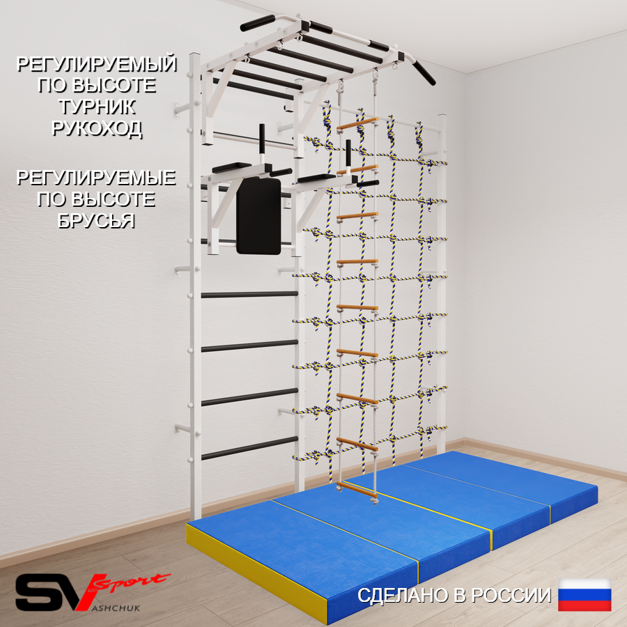 КОМПЛЕКТАЦИЯ: Шведская стенка Sv Sport (профиль вертикальных стоек 40 х 40 х 2 мм), Турник Sv Sport рукоход к ШС, Брусья Sv Sport к ШС, Лестница веревочная, Спортивный мат 100 х 200 х 10 см складной, Канатный лаз.