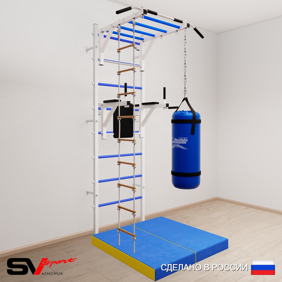 КОМПЛЕКТАЦИЯ: Шведская стенка Sv Sport (профиль вертикальных стоек 40 х 40 х 2 мм), Турник Sv Sport рукоход к ШС, Брусья Sv Sport к ШС, Лестница веревочная, Цепь удлинитель 90см, Мешок боксерский 22кг, Спортивный мат 100 х 100 х 10 см складной.