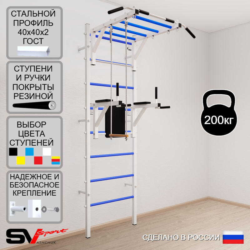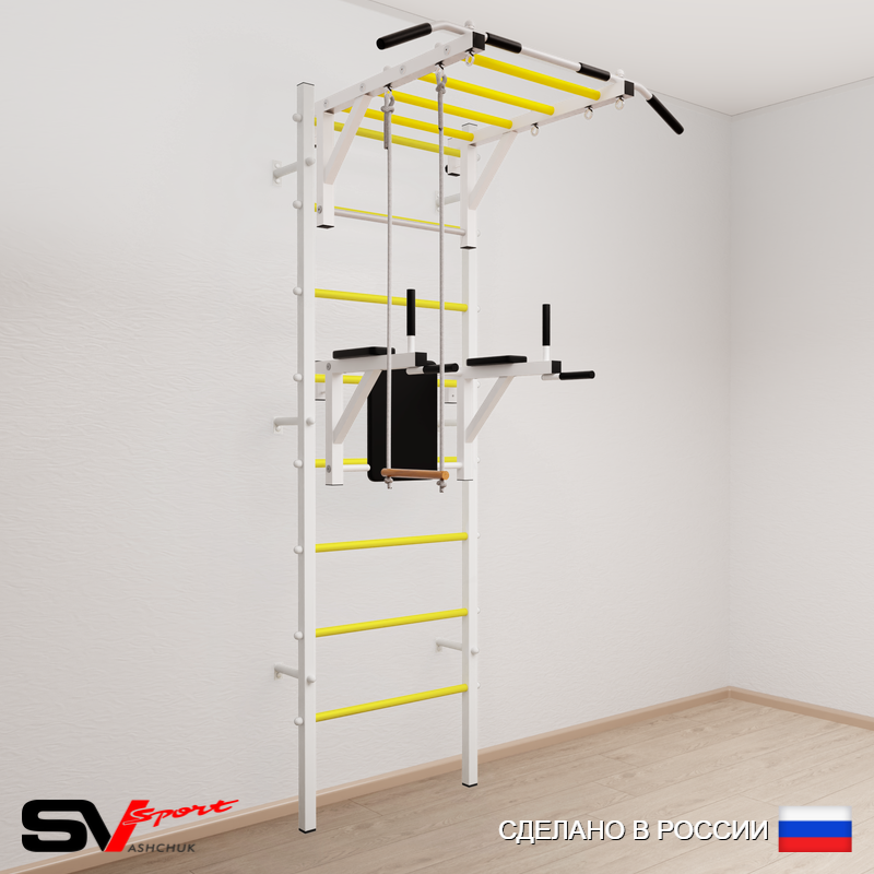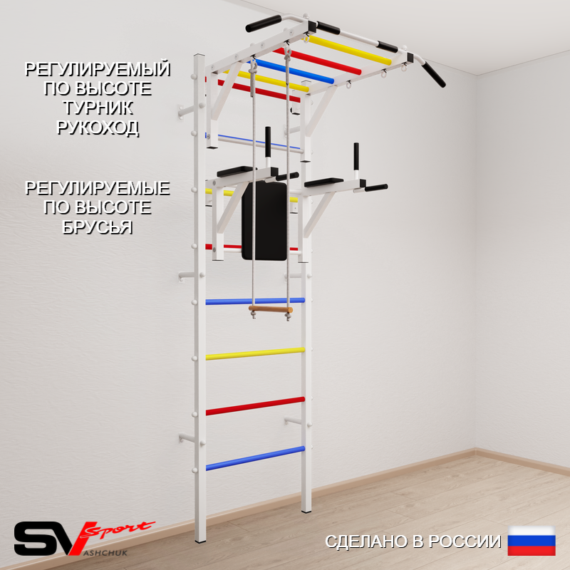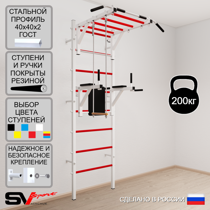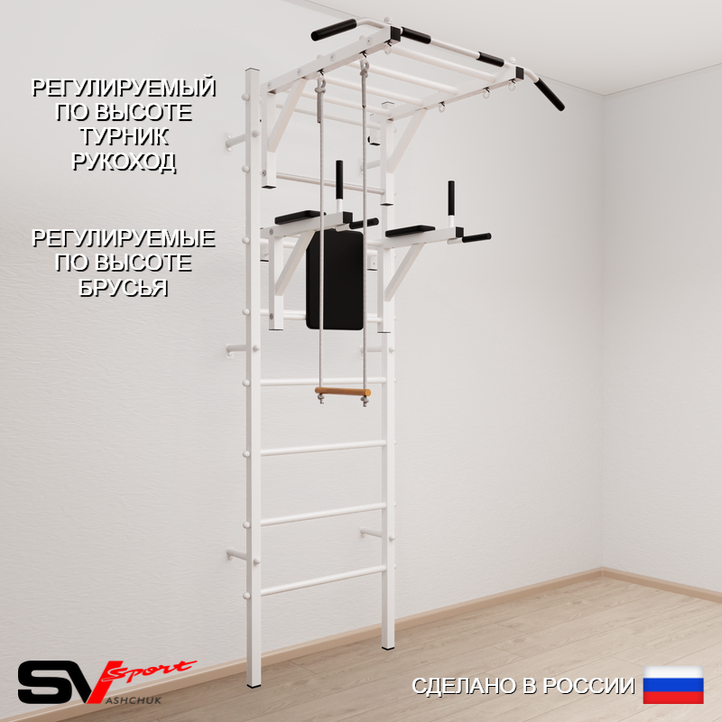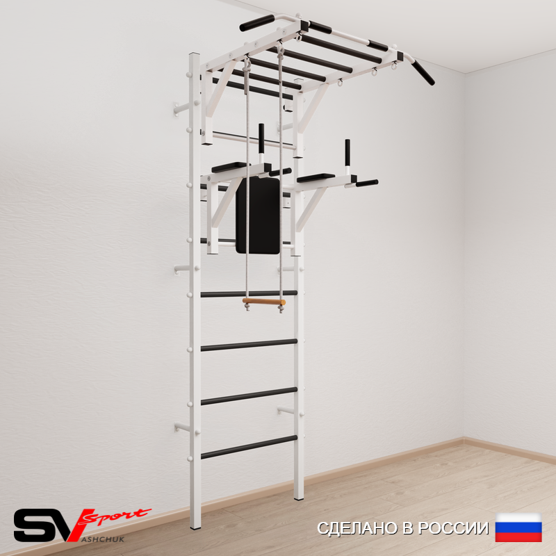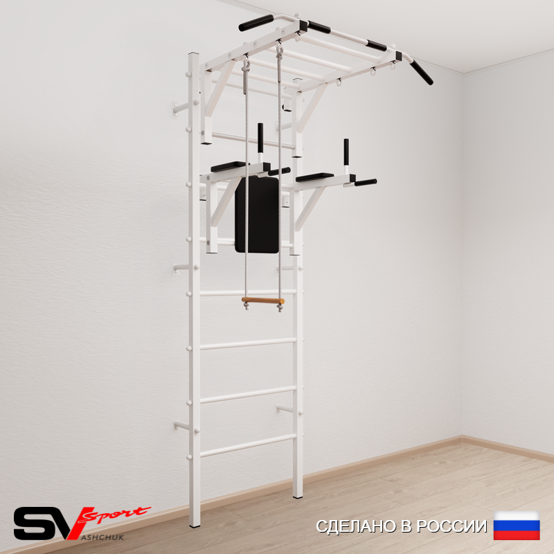 КОМПЛЕКТАЦИЯ: Шведская стенка Sv Sport (профиль вертикальных стоек 40 х 40 х 2 мм), Турник Sv Sport рукоход к ШС, Брусья Sv Sport к ШС, Трапеция.