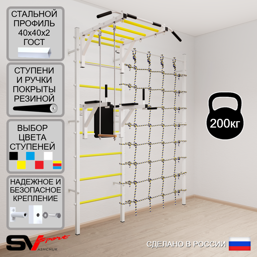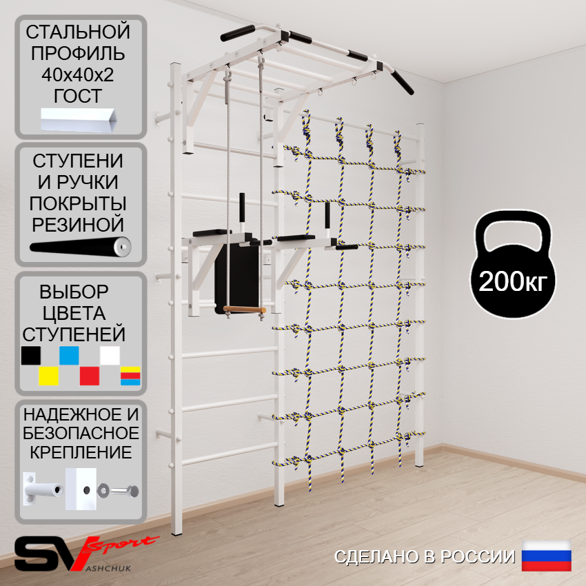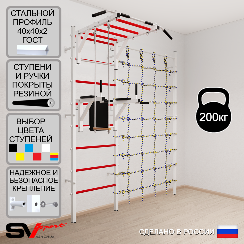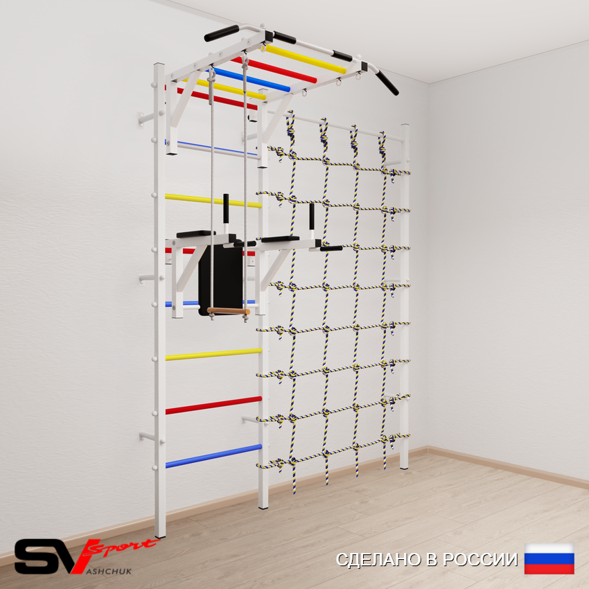 КОМПЛЕКТАЦИЯ: Шведская стенка Sv Sport (профиль вертикальных стоек 40 х 40 х 2 мм), Турник Sv Sport рукоход к ШС, Брусья Sv Sport к ШС, Трапеция, Канатный лаз.