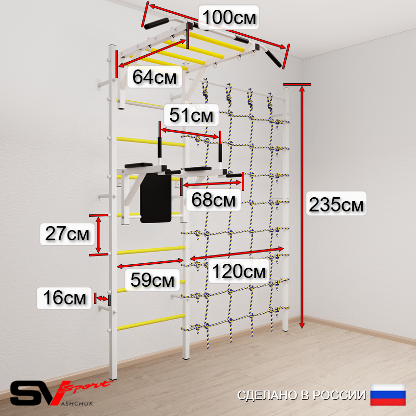 КОМПЛЕКТАЦИЯ: Шведская стенка Sv Sport (профиль вертикальных стоек 40 х 40 х 2 мм), Турник Sv Sport рукоход к ШС, Брусья Sv Sport к ШС, Трапеция, Цепь удлинитель 90см, Мешок боксерский 15кг, Канатный лаз.