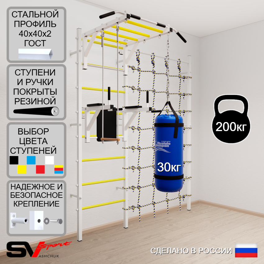 КОМПЛЕКТАЦИЯ: Шведская стенка Sv Sport (профиль вертикальных стоек 40 х 40 х 2 мм), Турник Sv Sport рукоход к ШС, Брусья Sv Sport к ШС, Трапеция, Цепь удлинитель 90см, Мешок боксерский 30кг, Канатный лаз.