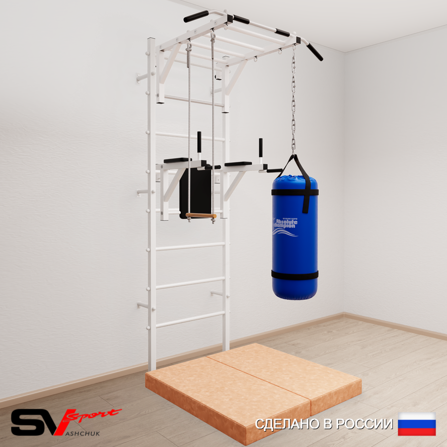 КОМПЛЕКТАЦИЯ: Шведская стенка Sv Sport (профиль вертикальных стоек 40 х 40 х 2 мм), Турник Sv Sport рукоход к ШС, Брусья Sv Sport к ШС, Трапеция, Цепь удлинитель 90см, Мешок боксерский 30кг, Спортивный мат 100 х 100 х 10 см складной.