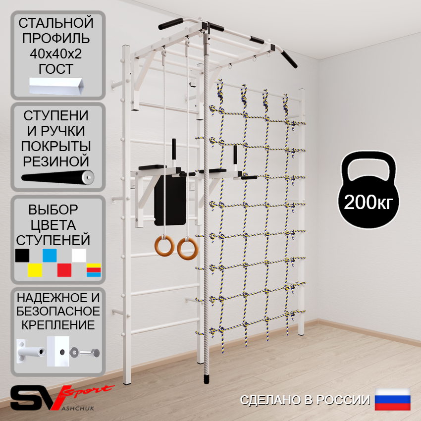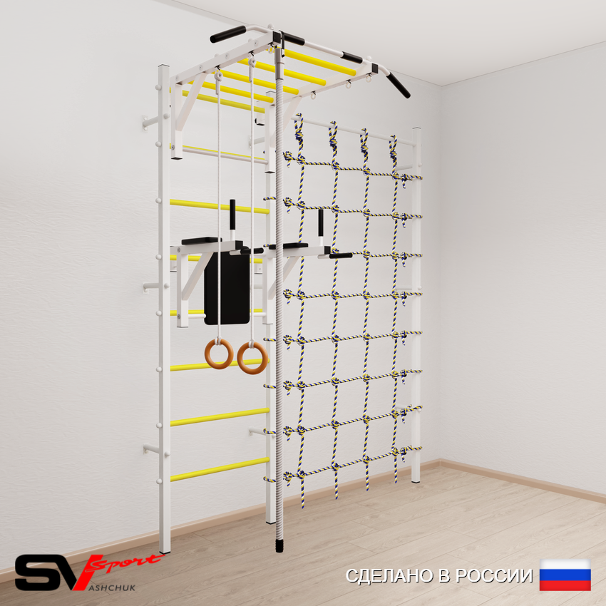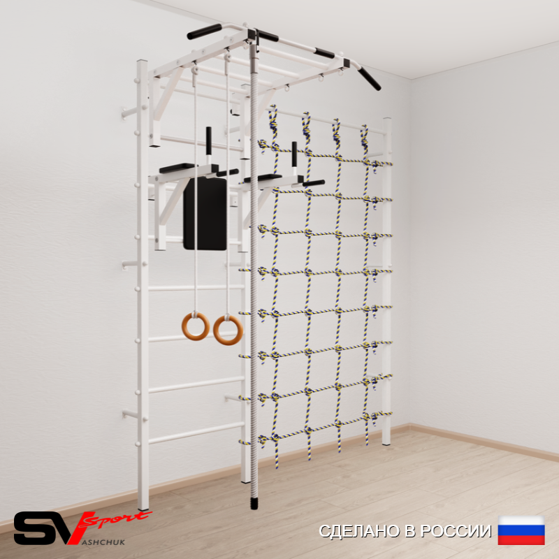 КОМПЛЕКТАЦИЯ: Шведская стенка Sv Sport (профиль вертикальных стоек 40 х 40 х 2 мм), Турник Sv Sport рукоход к ШС, Брусья Sv Sport к ШС, Kанат, Kольца деревянные, Канатный лаз.