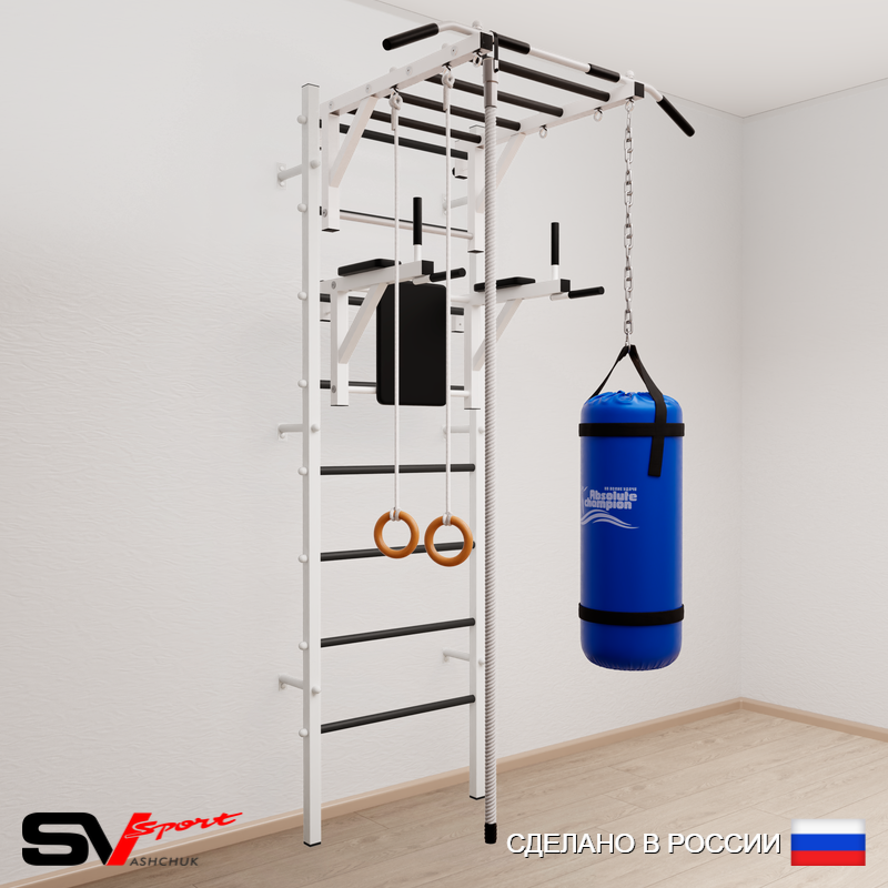 КОМПЛЕКТАЦИЯ: Шведская стенка Sv Sport (профиль вертикальных стоек 40 х 40 х 2 мм), Турник Sv Sport рукоход к ШС, Брусья Sv Sport к ШС, Kанат, Kольца деревянные, Цепь удлинитель 90см, Мешок боксерский 15кг.