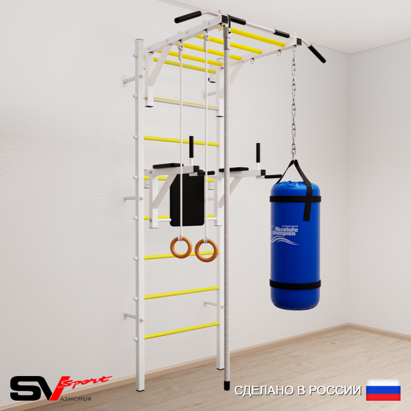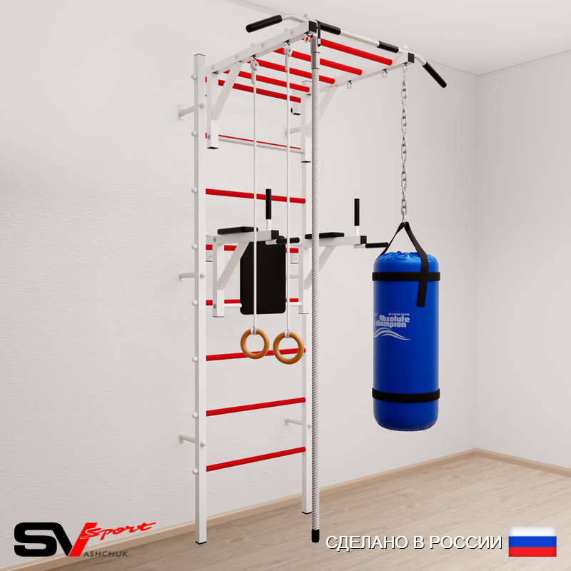 КОМПЛЕКТАЦИЯ: Шведская стенка Sv Sport (профиль вертикальных стоек 40 х 40 х 2 мм), Турник Sv Sport рукоход к ШС, Брусья Sv Sport к ШС, Kанат, Kольца деревянные, Цепь удлинитель 90см, Мешок боксерский 22кг.