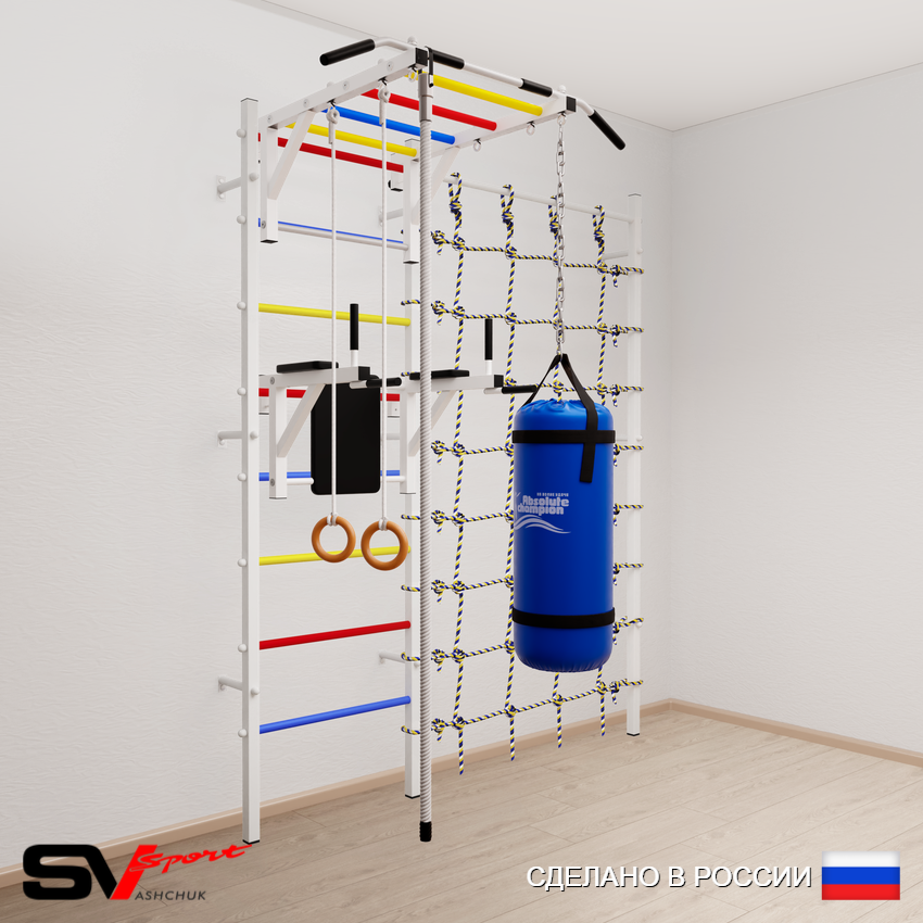КОМПЛЕКТАЦИЯ: Шведская стенка Sv Sport (профиль вертикальных стоек 40 х 40 х 2 мм), Турник Sv Sport рукоход к ШС, Брусья Sv Sport к ШС, Kанат, Kольца деревянные, Цепь удлинитель 90см, Мешок боксерский 22кг, Канатный лаз.