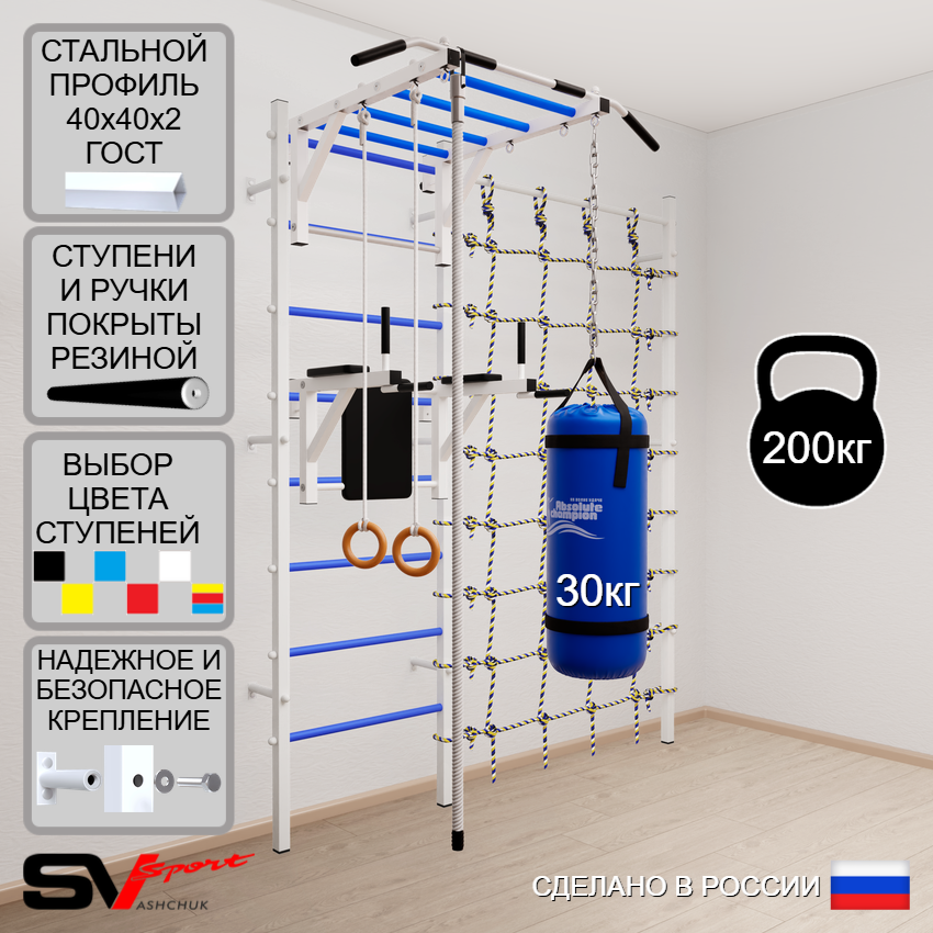 КОМПЛЕКТАЦИЯ: Шведская стенка Sv Sport (профиль вертикальных стоек 40 х 40 х 2 мм), Турник Sv Sport рукоход к ШС, Брусья Sv Sport к ШС, Kанат, Kольца деревянные, Цепь удлинитель 90см, Мешок боксерский 30кг, Канатный лаз.