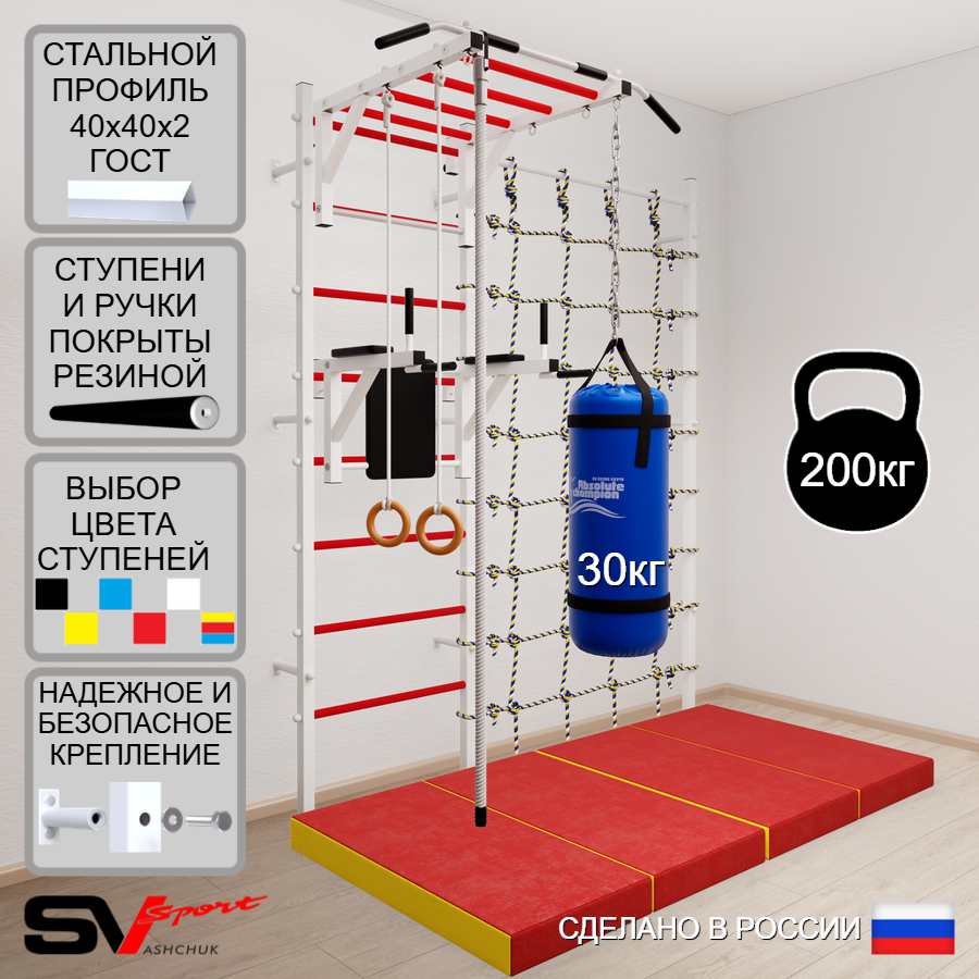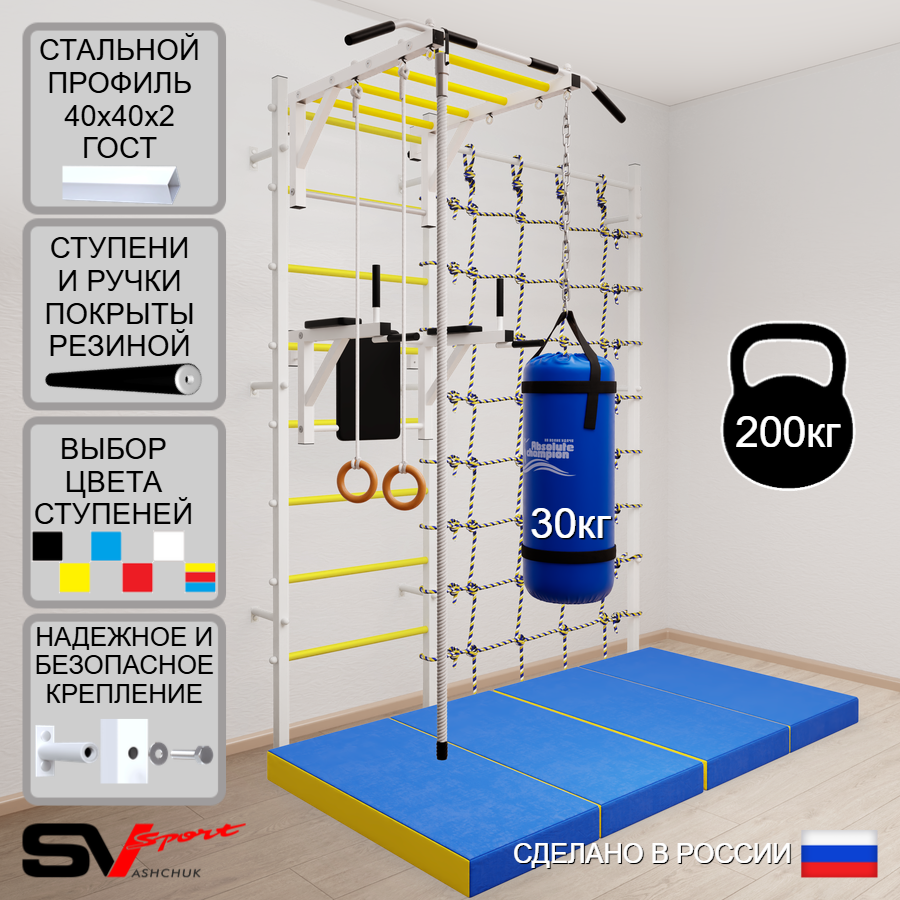 КОМПЛЕКТАЦИЯ: Шведская стенка Sv Sport (профиль вертикальных стоек 40 х 40 х 2 мм), Турник Sv Sport рукоход к ШС, Брусья Sv Sport к ШС, Kанат, Kольца деревянные, Цепь удлинитель 90см, Мешок боксерский 30кг, Спортивный мат 100 х 200 х 10 см складной, Канатный лаз.