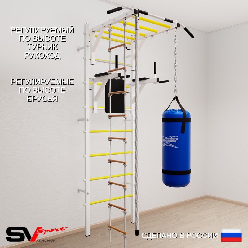 КОМПЛЕКТАЦИЯ: Шведская стенка Sv Sport (профиль вертикальных стоек 40 х 40 х 2 мм), Турник Sv Sport рукоход к ШС, Брусья Sv Sport к ШС, Kанат, Лестница веревочная, Цепь удлинитель 90см, Мешок боксерский 22кг.