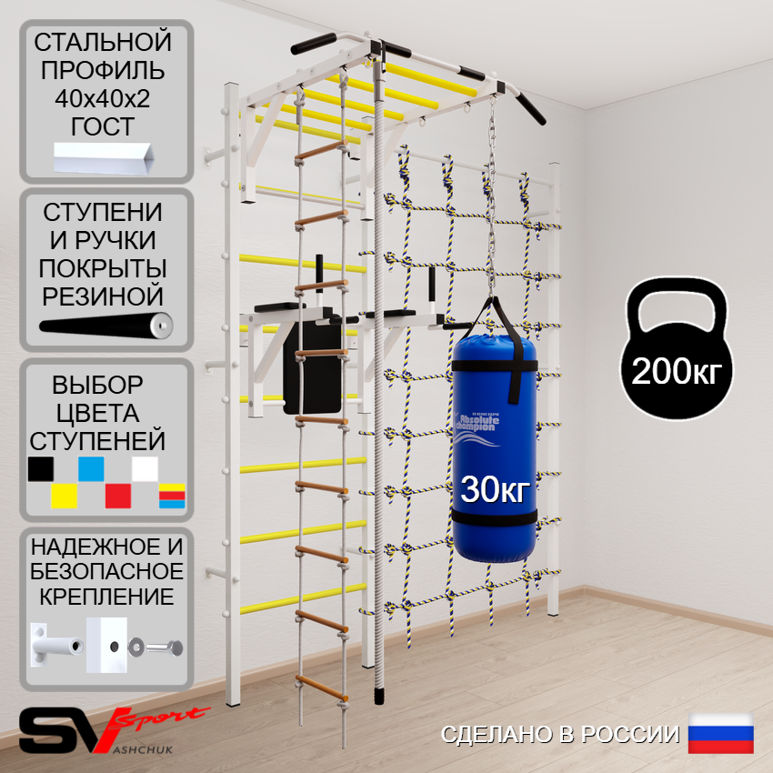 КОМПЛЕКТАЦИЯ: Шведская стенка Sv Sport (профиль вертикальных стоек 40 х 40 х 2 мм), Турник Sv Sport рукоход к ШС, Брусья Sv Sport к ШС, Kанат, Лестница веревочная, Цепь удлинитель 90см, Мешок боксерский 30кг, Канатный лаз.