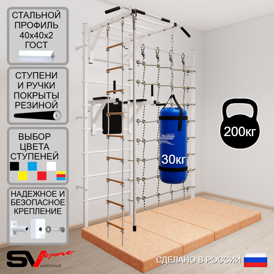 КОМПЛЕКТАЦИЯ: Шведская стенка Sv Sport (профиль вертикальных стоек 40 х 40 х 2 мм), Турник Sv Sport рукоход к ШС, Брусья Sv Sport к ШС, Kанат, Лестница веревочная, Цепь удлинитель 90см, Мешок боксерский 30кг, Спортивный мат 100 х 200 х 10 см складной, Канатный лаз.