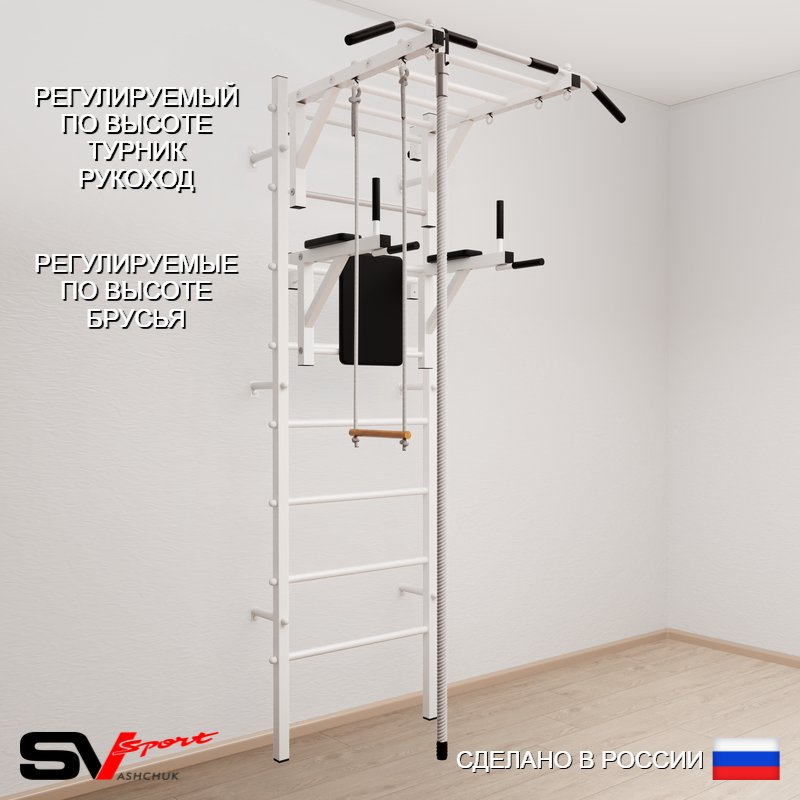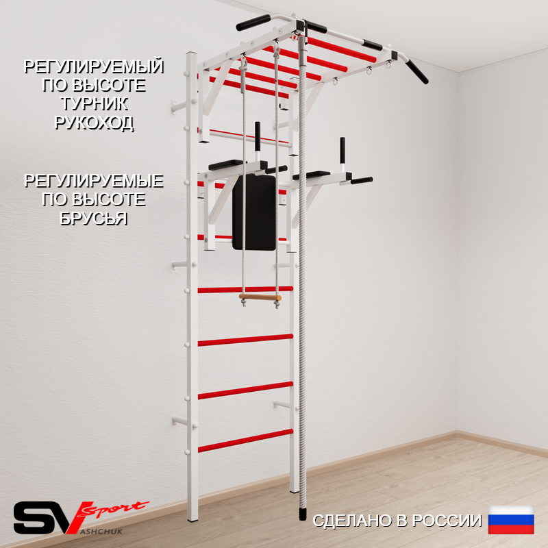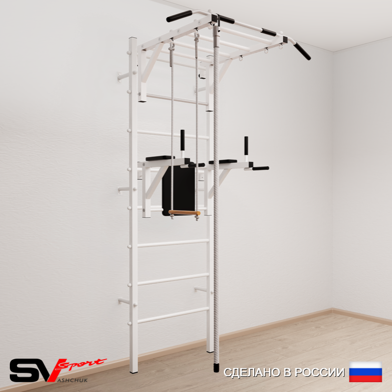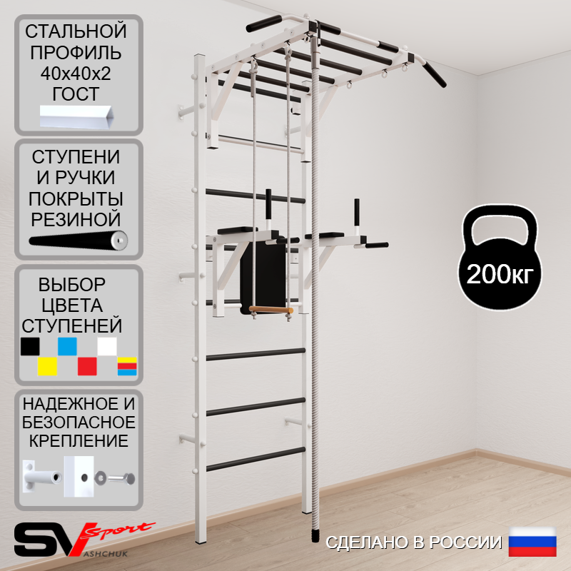 КОМПЛЕКТАЦИЯ: Шведская стенка Sv Sport (профиль вертикальных стоек 40 х 40 х 2 мм), Турник Sv Sport рукоход к ШС, Брусья Sv Sport к ШС, Kанат, Трапеция.