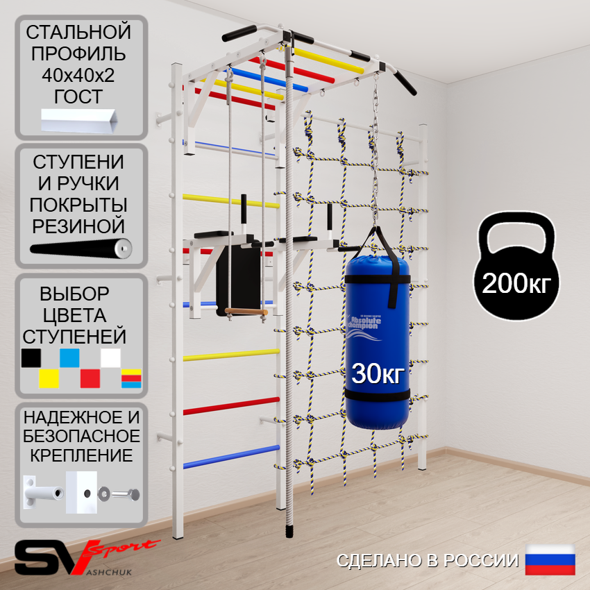 КОМПЛЕКТАЦИЯ: Шведская стенка Sv Sport (профиль вертикальных стоек 40 х 40 х 2 мм), Турник Sv Sport рукоход к ШС, Брусья Sv Sport к ШС, Kанат, Трапеция, Цепь удлинитель 90см, Мешок боксерский 30кг, Канатный лаз.