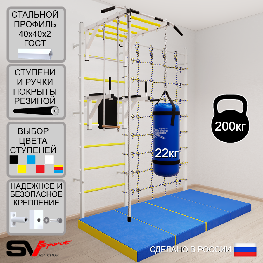 КОМПЛЕКТАЦИЯ: Шведская стенка Sv Sport (профиль вертикальных стоек 40 х 40 х 2 мм), Турник Sv Sport рукоход к ШС, Брусья Sv Sport к ШС, Kанат, Трапеция, Цепь удлинитель 90см, Мешок боксерский 22кг, Спортивный мат 100 х 200 х 10 см складной, Канатный лаз.