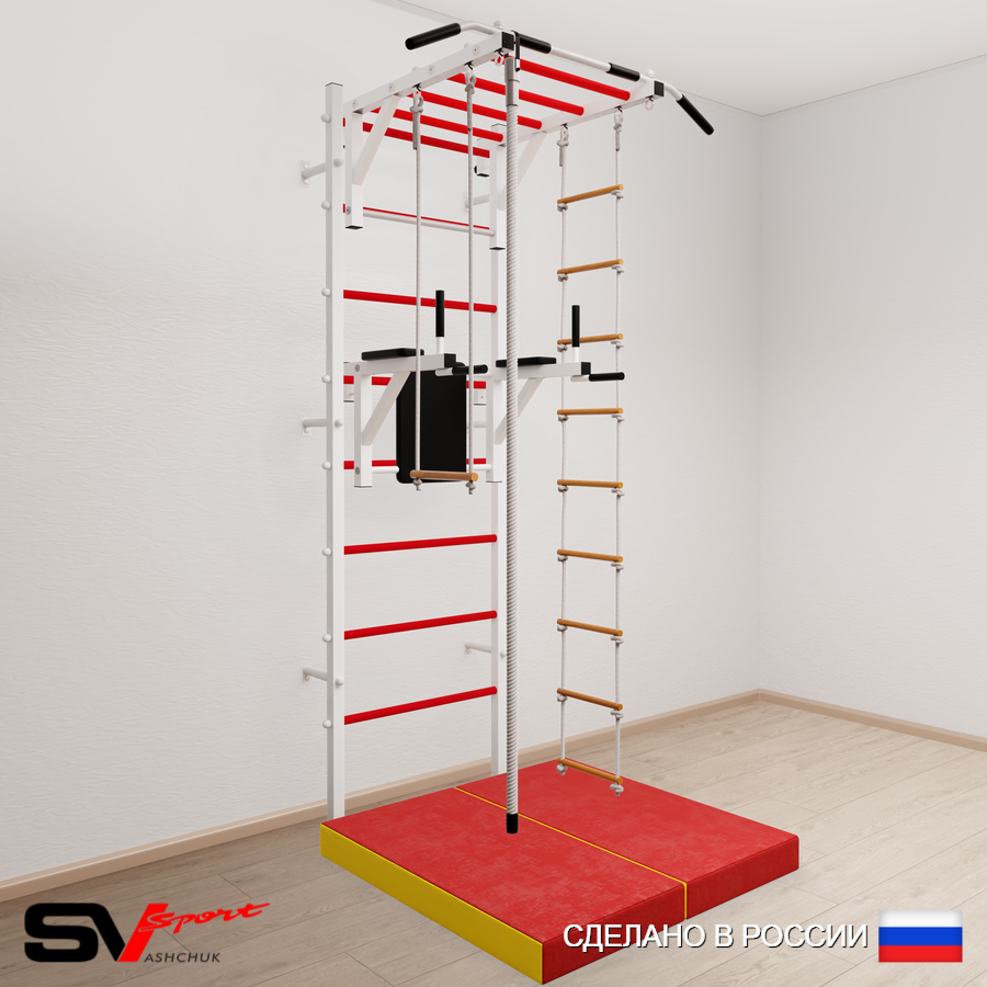 КОМПЛЕКТАЦИЯ: Шведская стенка Sv Sport (профиль вертикальных стоек 40 х 40 х 2 мм), Турник Sv Sport рукоход к ШС, Брусья Sv Sport к ШС, Kанат, Трапеция, Лестница веревочная, Спортивный мат 100 х 100 х 10 см складной.