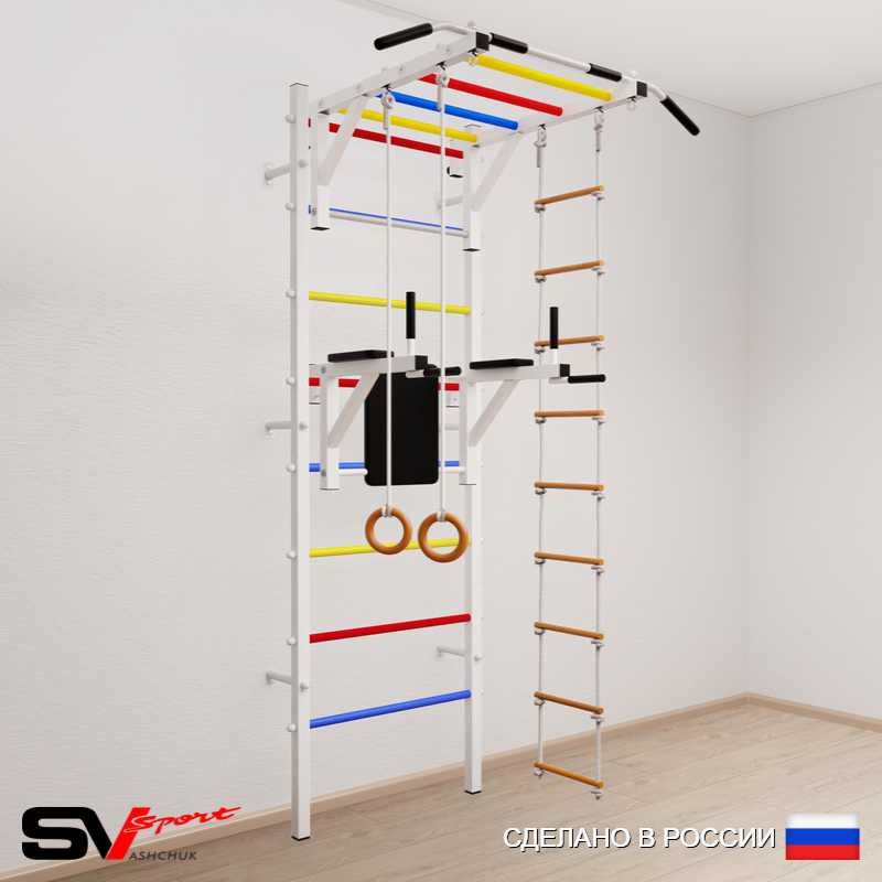 КОМПЛЕКТАЦИЯ: Шведская стенка Sv Sport (профиль вертикальных стоек 40 х 40 х 2 мм), Турник Sv Sport рукоход к ШС, Брусья Sv Sport к ШС, Kольца деревянные, Лестница веревочная.