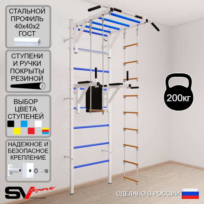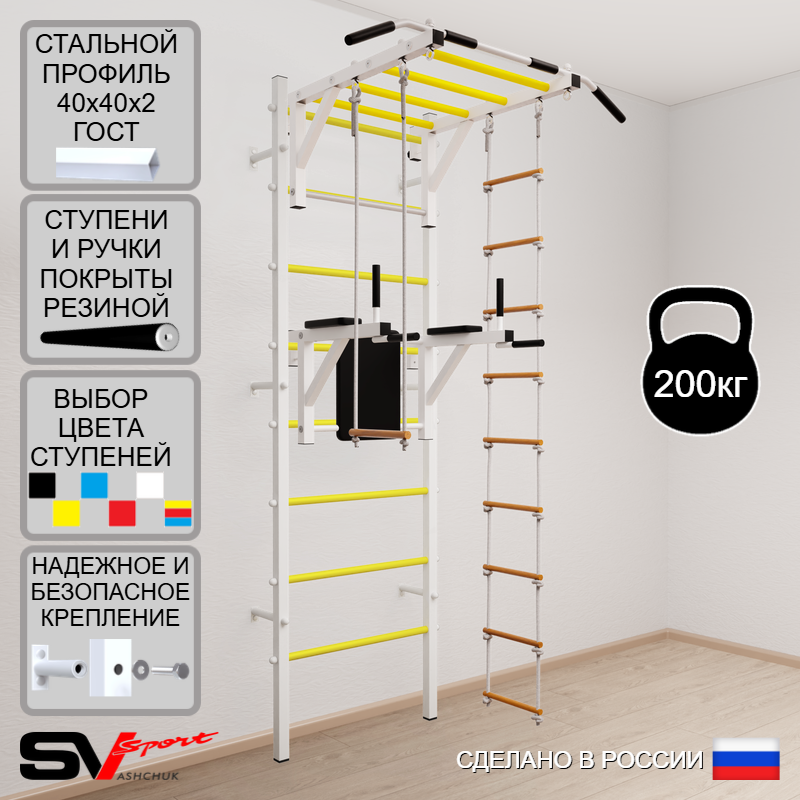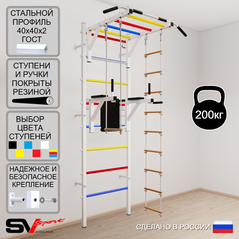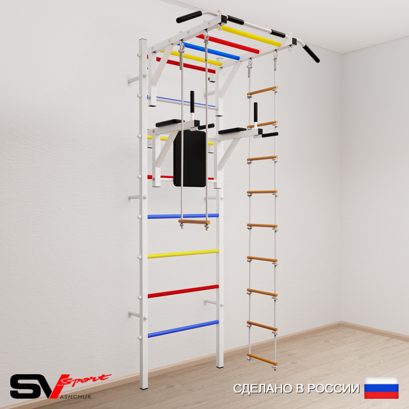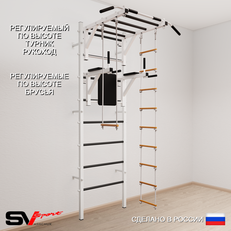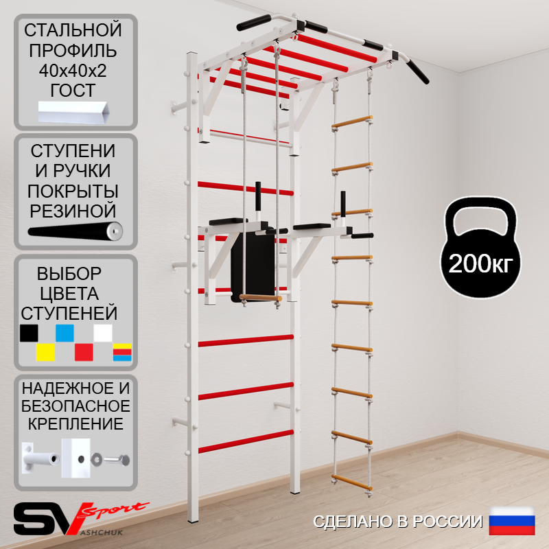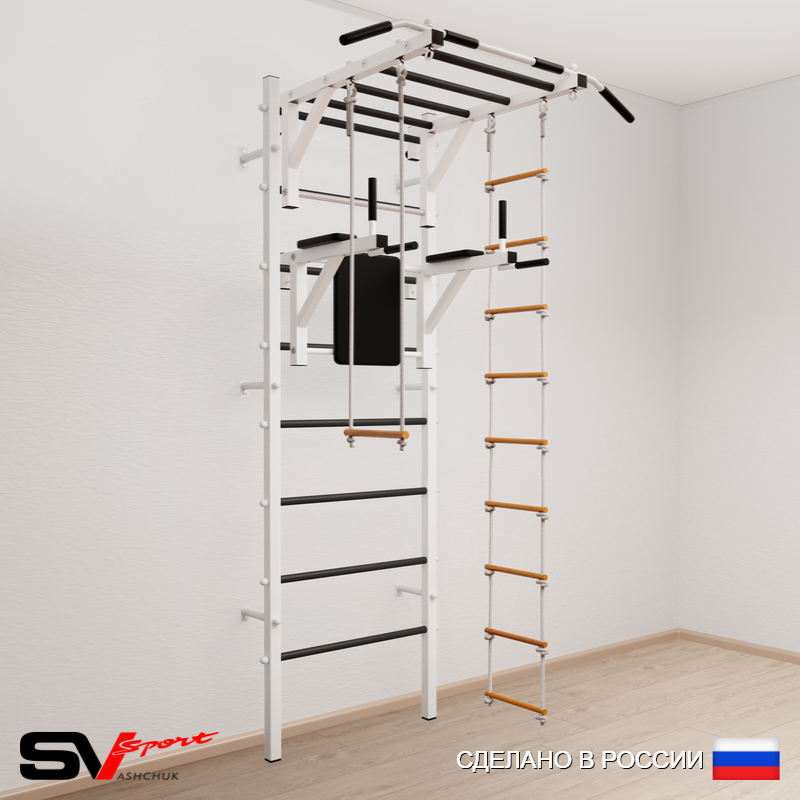 КОМПЛЕКТАЦИЯ: Шведская стенка Sv Sport (профиль вертикальных стоек 40 х 40 х 2 мм), Турник Sv Sport рукоход к ШС, Брусья Sv Sport к ШС, Трапеция, Лестница веревочная.