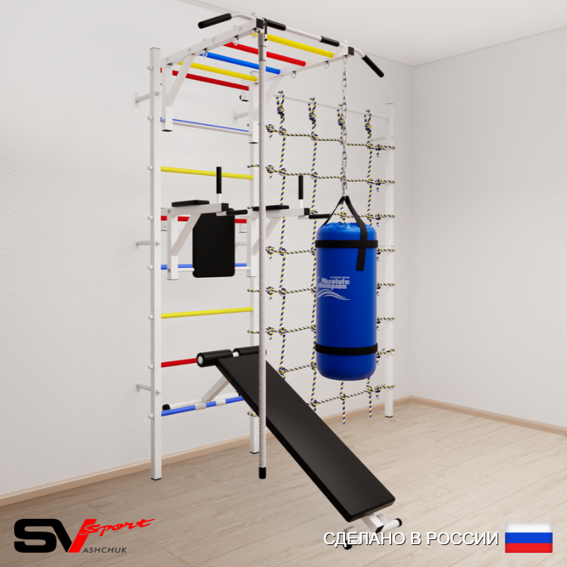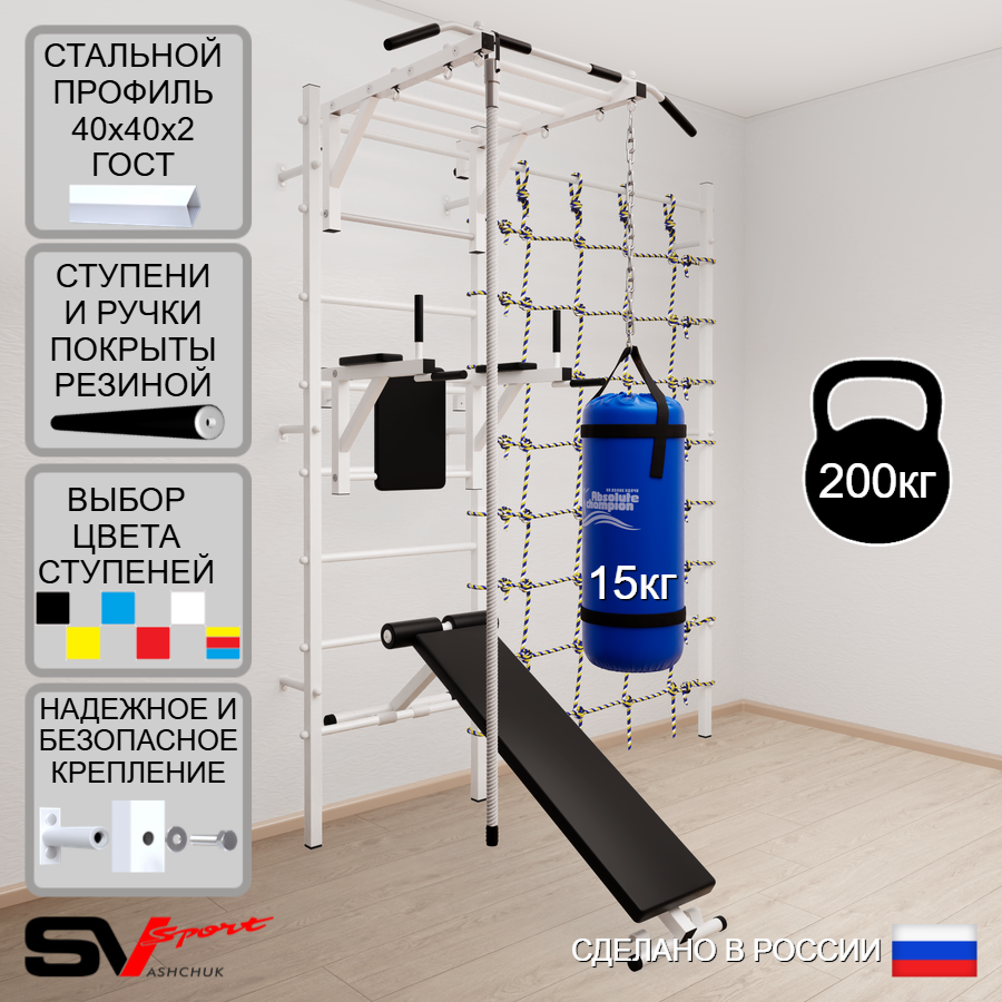 КОМПЛЕКТАЦИЯ: Шведская стенка Sv Sport (профиль вертикальных стоек 40 х 40 х 2 мм), Турник Sv Sport рукоход к ШС, Брусья Sv Sport к ШС, Скамья для пресса и жима Sv Sport к ШС, Kанат, Цепь удлинитель 90см, Мешок боксерский 15кг, Канатный лаз.