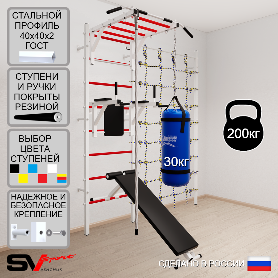 КОМПЛЕКТАЦИЯ: Шведская стенка Sv Sport (профиль вертикальных стоек 40 х 40 х 2 мм), Турник Sv Sport рукоход к ШС, Брусья Sv Sport к ШС, Скамья для пресса и жима Sv Sport к ШС, Kанат, Цепь удлинитель 90см, Мешок боксерский 30кг, Канатный лаз.