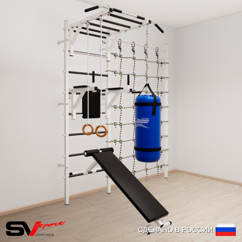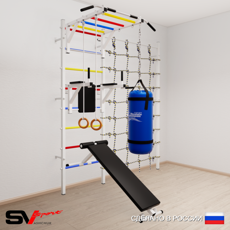КОМПЛЕКТАЦИЯ: Шведская стенка Sv Sport (профиль вертикальных стоек 40 х 40 х 2 мм), Турник Sv Sport рукоход к ШС, Брусья Sv Sport к ШС, Скамья для пресса и жима Sv Sport к ШС, Kольца деревянные, Цепь удлинитель 90см, Мешок боксерский 15кг, Канатный лаз.